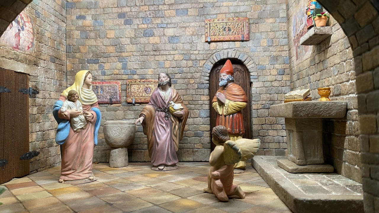 Este año he decidido poner una nueva escena en nuestro pesebre familiar. Se trata de la Presentación del niño Jesús en el templo. Puesto que el belén está ambientado en un pueblo, no podía añadir un templo romano en medio de la plaza, así que se me ocurrió hacer una pequeña capilla románica y recrear la presentación allí. Me inspiré en las iglesias románicas del Valle de Arán, concretamente en la iglesia de Gausac y en la de Bossost (el pueblo de mi madre) y que casualmente está dedicada a la Purificación de la Virgen. De ellas he reproducido las portaladas y algunas pinturas y paneles del interior. También he reproducido una virgen románica, la de Meritxell de la que hice un molde de un imán y acabé de modelar con pasta. En un rincón del interior de la iglesia hay una pequeña sorpresa y es que, mientras buscaba una virgen para reproducir en la capilla, mi padre me trajo una pequeña imagen de plástico medio despintada de la virgen del Pilar, que tenía en un cajón y que no sé donde la encontró, el caso es que al ser una imagen religiosa, no la quiso tirar y la guardó. Cuando le comenté lo que quería hacer, me la dió y me dijo: aprovéchala, igual te sirve. Claro que para una iglesia románica no me pegaba una virgen del Pilar... pero me daba pena dejarla como estaba, toda despintada y vieja, así que la pinté, le hice el pilar y lo pinté simulando el pilar auténtico. Total, que le busqué un rinconcito en la iglesia y aquí está. Si uno echa un vistazo rápido a la escena no se aprecia pero , si se detiene a ver todas las esquinas del interior, allí está, en un pequeño pedestal. Y no deja de ser un homenaje a mi patrona, puesto que yo me llamo Pilar😜.