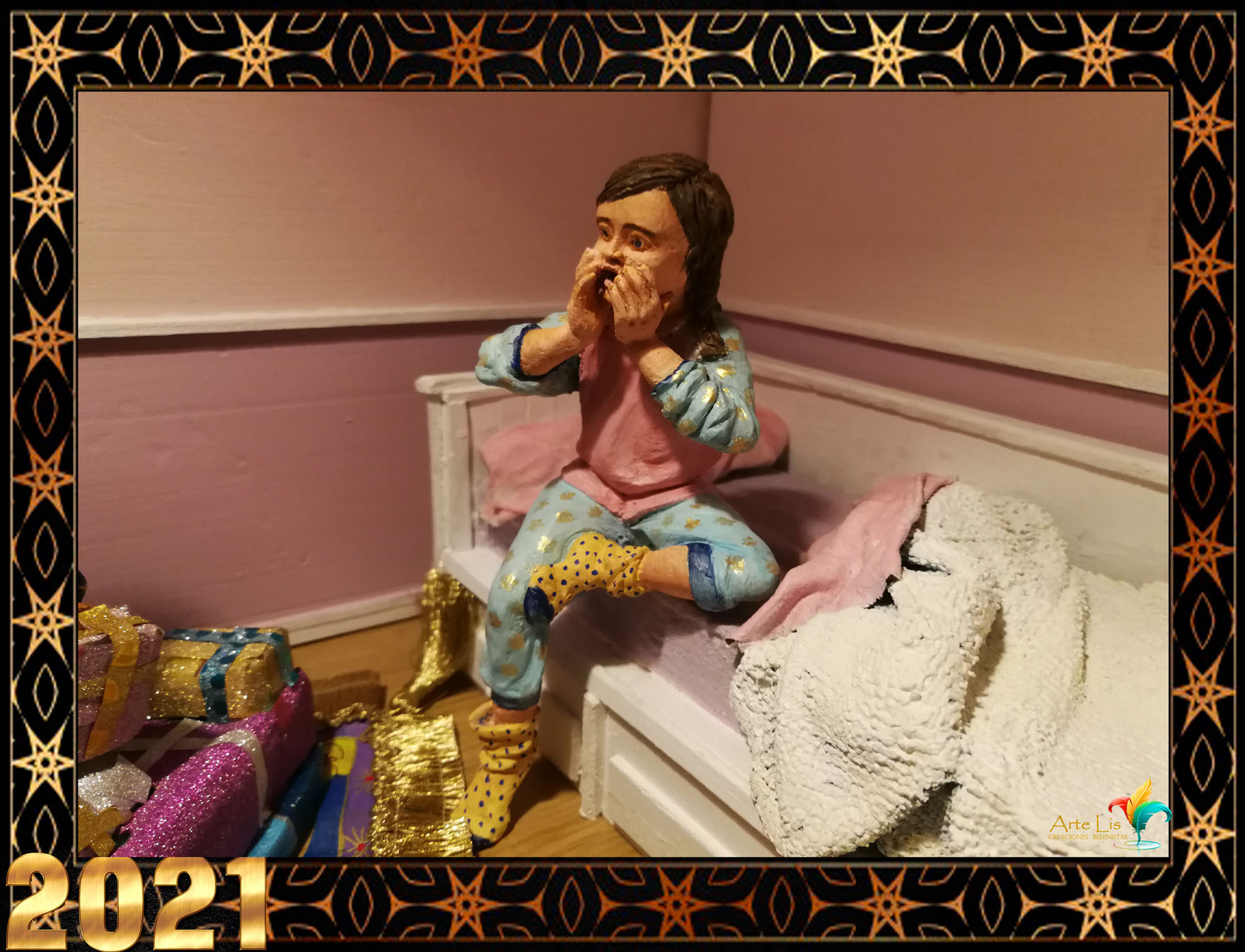 La escena, representa la noche mágica, es una reproducción del dormitorio de mi hija con sus muebles, su cortina,juguetes y los regalos que le han traido estas Navidades. Ella se despierta y al encender la luz del dormitorio descubre que los Reyes Magos han llegado y le están haciendo entrega de regalitos (los Reyes van atabiados con las vestimentas de la película de Aladdin)