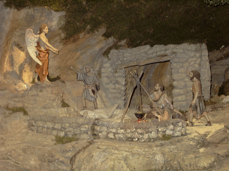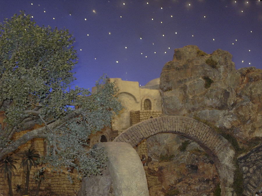 Al terminar la filmación te dicen que no te agolpes al principio, que la sala es grande y que aunque empieces a ver el Belén por el medio o por el final, después puedes ir al principio para verlo completo. Total, que te pasan a la sala y cuando entras te quedas alucinada cuando ves el conjunto porque es cierto que el Belén es una obra de arte.; a los treinta segundos y sin previo aviso se apagan todas las luces y se hace de noche, asi, de golpe ¿donde están las fase de amanecer, día ... ?, ¿eso que tanto nos preocupamos nosotros por saber cómo instalar y que ponemos en belenes minúsculos?.