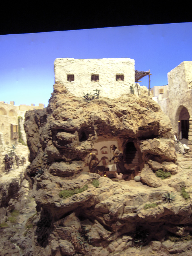 Al terminar la filmación te dicen que no te agolpes al principio, que la sala es grande y que aunque empieces a ver el Belén por el medio o por el final, después puedes ir al principio para verlo completo. Total, que te pasan a la sala y cuando entras te quedas alucinada cuando ves el conjunto porque es cierto que el Belén es una obra de arte.; a los treinta segundos y sin previo aviso se apagan todas las luces y se hace de noche, asi, de golpe ¿donde están las fase de amanecer, día ... ?, ¿eso que tanto nos preocupamos nosotros por saber cómo instalar y que ponemos en belenes minúsculos?.