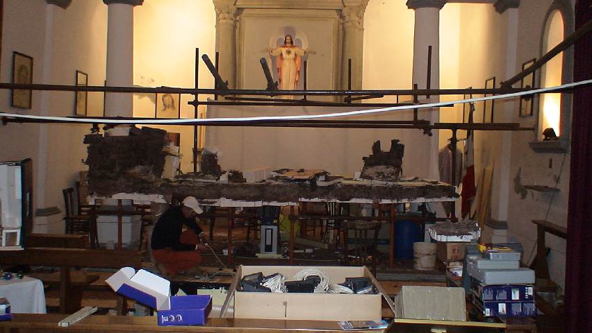 la seconda finestra nel buio si accende, stanza completamente a lume di candela, luce lunare che penetra dentro la stanza dove Maria riposa presso un piccolo masso, la Finestrella sbatte a tempo sia aperta che chiusa , successivamente la porta si apre facendo entrare la luce notturna, in quell istante Maria viene colpita dalla presenza divina, con una luce concentrata Gialla, impaurita si alza a mezzo busto e fà cadere alcuni ciottoli presso di essa, il messaggero la informa che avrà un figlio, durante il dialogo, i cani abbaiono da questa presenza con vento forte.....la terza finestra si accende e viene proposto il primo spostamento della sacra famiglia nella città di Betlemme, si ritorna al video, con il primo RE magio a seguire la stella, ora si ritorna alla ricerca della locanda , illuminata con un bel rosso per dare illusione dello scorrere del tempo , quà avviene il dialogo con Oste, non c è posto. Si ritorna al video con il secondo RE magio, il quale anch esso viene attratto dalla stella seguendola nel suo percorso. Si rientra nella scena della locanda, con luce lunare , la domestica parla che non troverà posto,...gli indica delle grotte fuori betlemme.....si riaccende il video con il terzo RE magio che segue anch esso la stella. A questo punto con il Cavuby dovevamo far riunire i tre Magi, ed il posto più idoneo era presso un tempio Egizio, con la ricostruzione sulle sue pareti di geroglifici di preghiere verso i loro dei, due statue 5 piccole sfingi e il carrello che piano piano si sposta all incontro di essi.... stelle a fibre e cometa appaiono in dissolvenza .....la nascita di Gesù avviene con un pianto di bambino, la grotta s illumina dalla luce divina protettiva senza far vedere il presepe, la luce indica la via il percorso da seguire, l acqua che scorre vicino alla grotta fonte di vita, il fuoco anch esso interpretato dalla lanterna di S Giuseppe due simboli fondamentali. Ora al visitatore appare tutto il presepe che s illumina piano piano nelle sue forme, con gli effetti immessi la nascita del giorno, l alba del sole che cammina da dietro in diagonale, lo sfondo di un celeste intenso , il mare ondoso, il sole che tramonta ( quà per problemi di lontananza non rende,troppo veloce, non cè il giallo e arancio, lo modifichiamo con una lampada più potente il prossimo anno,,,deve essere gialla per immettere l arancio e giallo tenue sul telo ) quando è sotto il cielo s illumina di un bel color rosso accesso che và ad affievolirsi, stelle dietro. Il cielo celeste cambia piano piano in 3 colori diversi.I magi che dentro ad una casa omaggiano di doni la sacra Famiglia. La scena finale video è di Erode che scatena la collera del temporale..si ritorna alla fuga in egitto con il video e i titoli finali dei suoi partecipanti