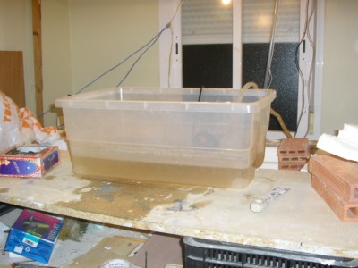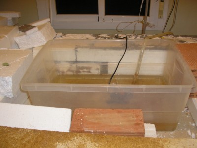 Tendremos que delimitar la zona que queremos que " llueva " . Seguidamente haremos un hueco para encajar el deposito donde recogeremos el agua que cae del techo , para crear un circuito cerrado por donde correra el agua , avanzamos protegiendo los 4 lados del foso con plasticos para buscar la estanqueidad que necesitamos, para que no nos salga agua por todos lados , este paso es muy importante pues de el depende que no se nos filtre el agua y nos arruine nuestra obra una vez echo este paso hacemos un marco de madera , como si de un cuadro se tratase , en el cual clavamos tela de mosquitera,( yo lo hice con chinchetas y me fue bastante bien) .Con el cubrimos todo el contorno de el foso o cubeta donde ira a parar el agua , antes tendremos la precaucion de incluir la bomba de agua que hara subir el agua hasta el techo , para que caiga, en forma de lluvia.Para la caida del agua realice otro marco , al que clave un trozo de tela metalica pero que no sean muy grandes los agujeros ,en la cual puse unos trozos de tubos de goma en los cuales hice agujeros con el soldador con cuidado de no hacer los agujeros muy grandes para que no salga un chorro de agua ,cubrir con los tubos necesarios a nuestro gusto.