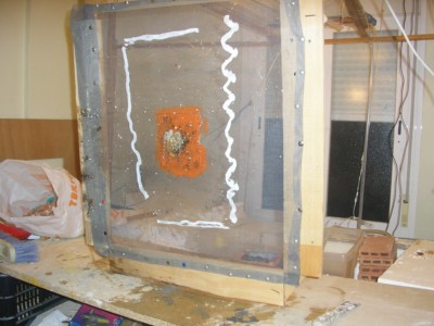 En un espejo dibuja la forma quebrada caracteristica de un rayo con un punzon arañé todo el dibujo dejandolo transparente, cuando lo terminé lo pegé en una caja en la que meti una bombilla unida a un cebador de fluorescentes, para que parpadee .