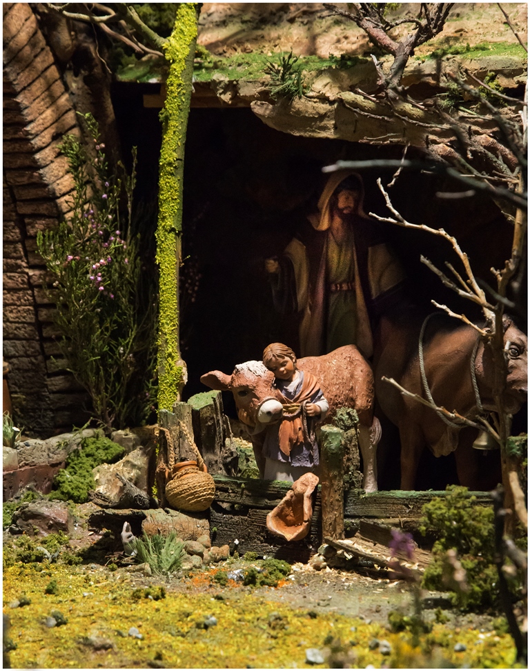 Fantástico Belén que auna unas figuras preciosas con un apuesta en escena tan naturalista, que casi se pueden oler las plantas y matorrales que afloran alrededor de ella. Mención aparte merece la figura del chiquillo pescando tan llena de movimiento y de gracia, que por si sola ya cautiva en un primer visionado.