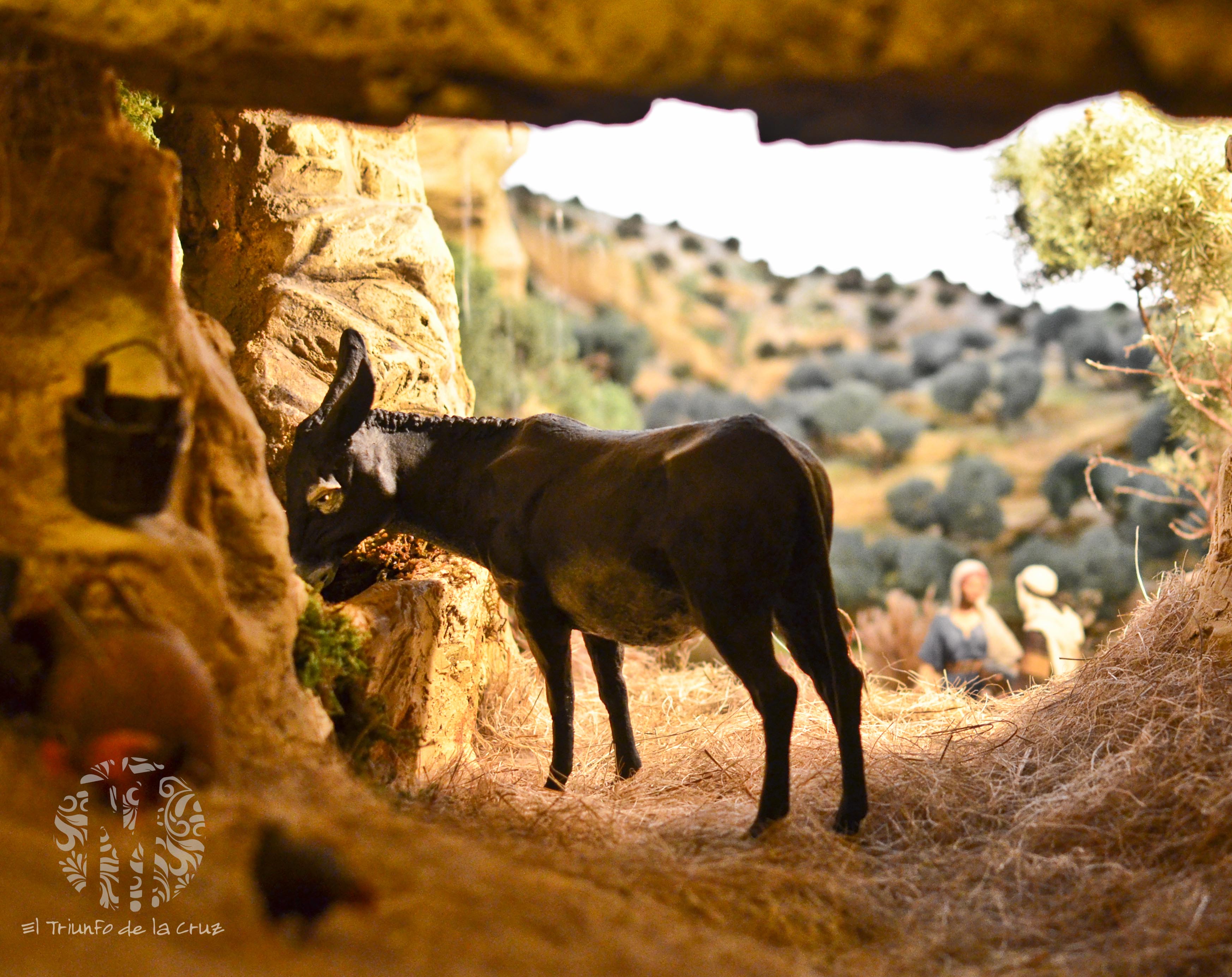 A la derecha de la escenografía, elevada en altura, se encuentra la Sagrada Familia sobre un lecho de paja y rodeada de vasijas, ánforas y tinajas, mientras que en la parte inferior se encuentra la mula y el buey. En ambos planos hay unas aberturas en la gruta que dejan entrever un maravilloso campo de olivos con algunos campesinos dialogando en la lejanía, así como la aparición de la luna cuando anochece en el belén.