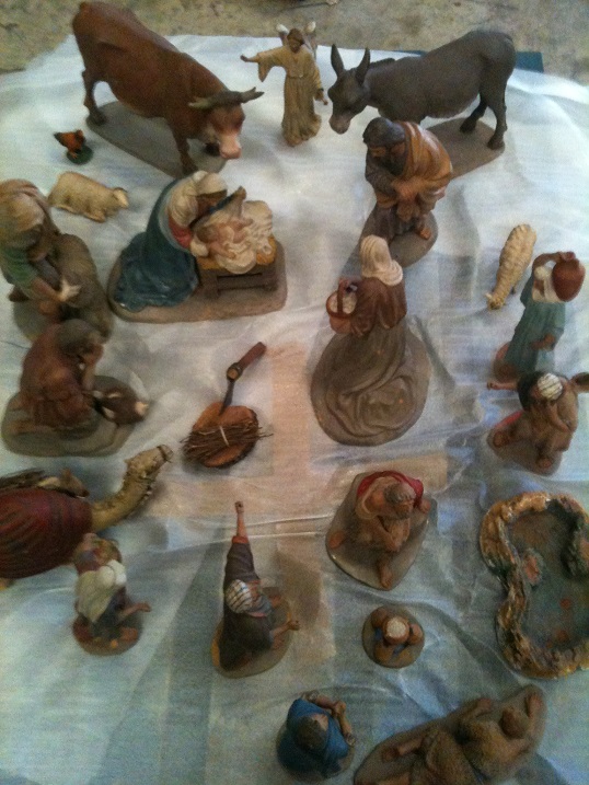 Bueno, hay muchas figuras y de tamaños variados, todo lo que veo Castells salvo un camello murciano que se asoma por un lado. Tienes el nacimiento de Murillo entero, o casi (no veo el pastor con la oveja a los hombros, pero no es muy relevante si tienes la místico, la señora de la cesta de huevos y el pastor con la cabra) y parece muy bien ejecutado, entre mil y mil quinientos, yo vendí una anunciata muy parecida por unos cuatrocientos, me parece, y hay que ver el resto... no sé, yo creo que el lote vendido barato son mil quinientos, vendido por su parte alta, dos mil quinientos... pero no creo que el mercado pueda asumir tanto dinero en una sola operación, yo partiría el lote en Murillo, Anunciata y el resto...