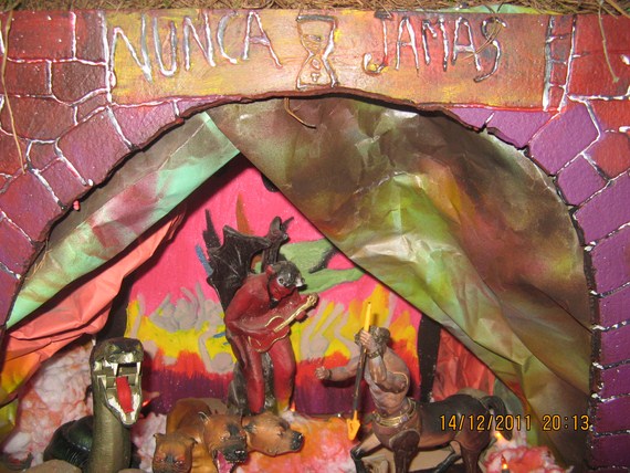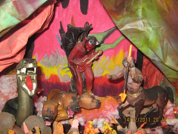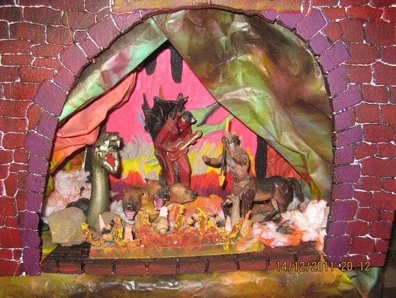 La cartela es un recuerdo infantil, que la verdad no se si esté inspirado en la Divina Comedia, pero en un viejo libro de esos que tenían ilustraciones, una tía nos leía sobre distintos aspectos de la fe y al tocar el tema del infierno, decía que había 7 puertas cada una presidida con la figura de un animal que representaba a cada uno de los 7 pecados capitales (el cerdo, la gula, el pavoreal la vanidad, el macho cabrío, la lujuria etc.) y que los condenados sufrían, se desesperaban y maldecía horriblemente atormentados por los demonios, y un reloj repetía incansable: Nunca jamás, la setencia de no abandonar eternamente ese sitio y ese tormento.