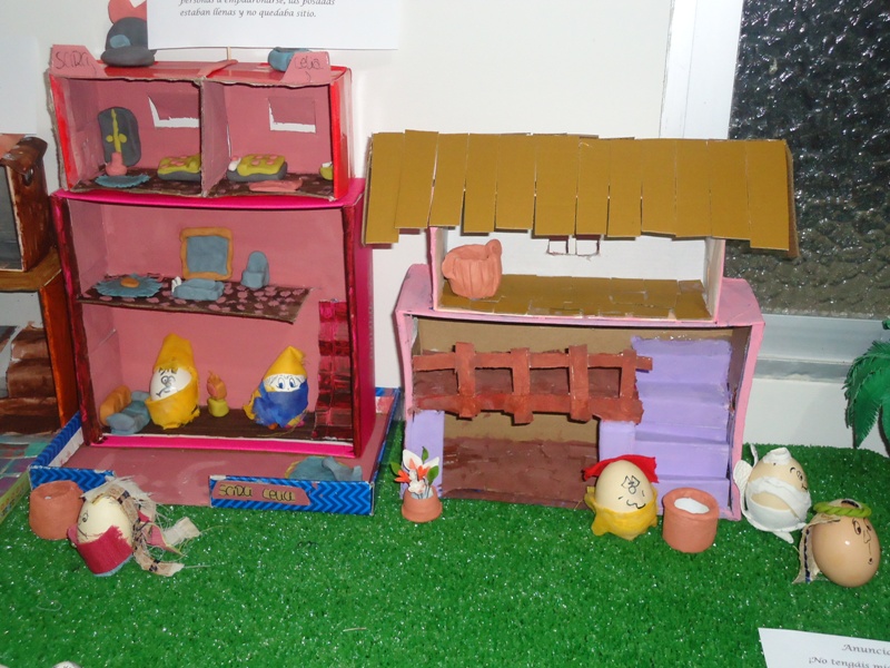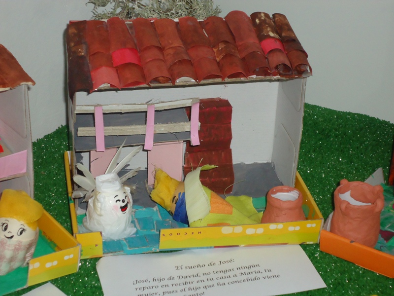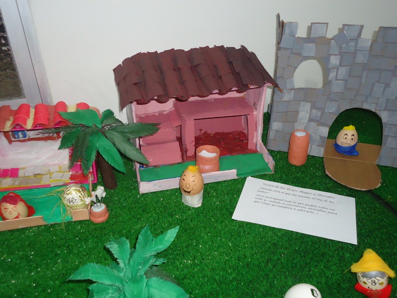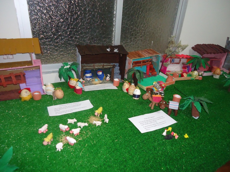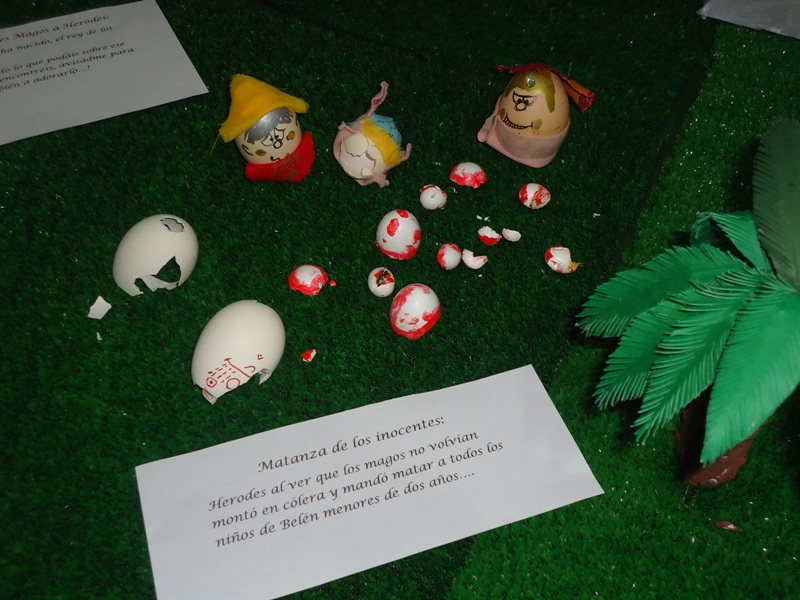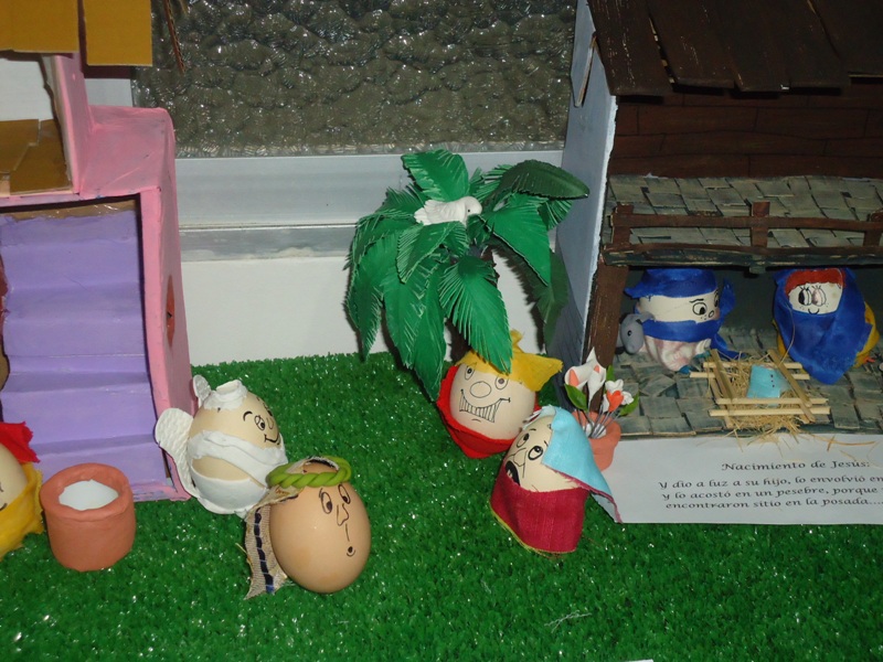 madre mia, ademas, para hacer cosas asi, con niños tan chicos, hay que tener espiritu, yo no hubiera sido capaz ni de pensarlo, de verdad... que muerte por dios! yo no soy muy niñero, y me hubieran sacado de los nervios jajaja, asiq ue doble felicitación. olle, una propuesta: para otro año, podeis utilizar huevos de codorniz para hacer a los niños. el unico problema que tiene es que el casacarón es un poquito duro, pero igual le encontrais el truco a vaciarlos y podeis hacer al niño jesus, angelitos, niños pastores... jejeje. incluso algun animal en version huevo puede colar y todo.