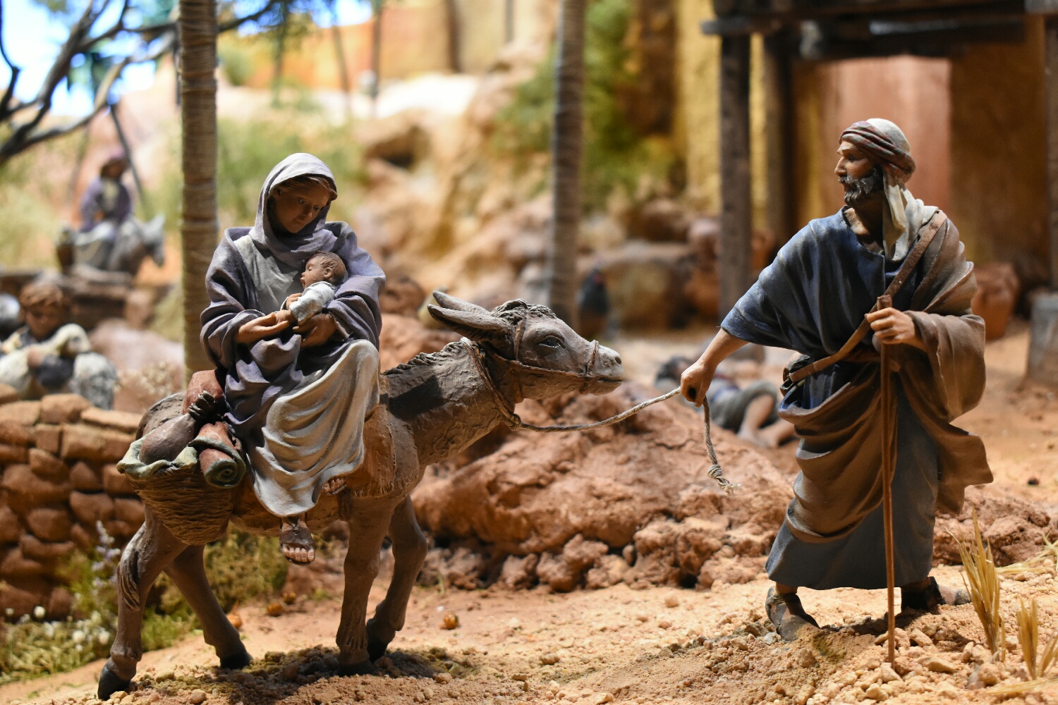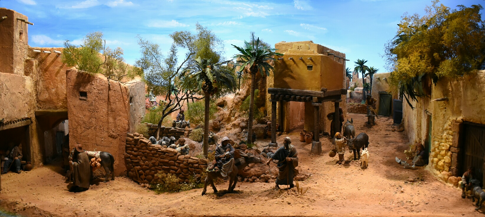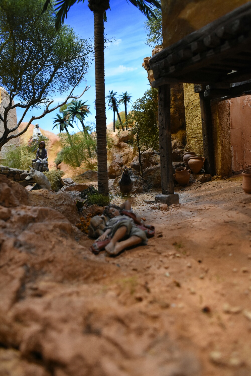 La vegetación es una mezcla de materiales naturales y sintéticos. Las naturales consisten en ramas secas para los troncos y para las copas una planta tratada que se llama teloxys aristata la cual pinto con distintos sprays, verdes y naranjas. Las palmeras de proximidad son cañas, para el tronco, que se cubren con hilo de bramante finito (el de cocinar) y se pintan, la parte alta del tronco con escamas de piñas secas y los penachos de hojas, bien con cartulina o bien con cinta de carrocero pintadas con acrílicos. Las palmeras de fondo son las típicas de plástico.