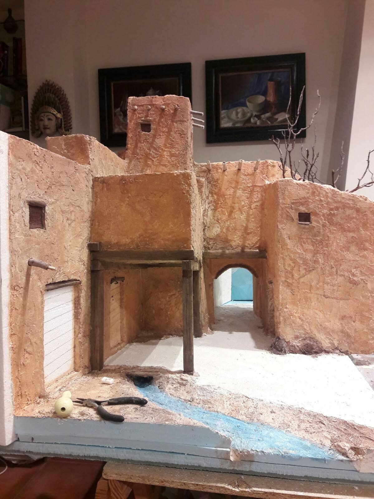 En realidad lo he tenido un mes en el salón construyendo a ratos perdidos. Lo empecé en el taller como siempre pero, al no tener una idea clara de lo que quería hacer puesto que no había hecho un boceto previo, el módulo sobre el que estaba trabajando iba teniendo unas dimensiones considerables que me obligaron a meterlo en el salón en previsión de que luego no pudiera entrar por las puertas jajaja. El problema vendrá cuando lo desmonte porque lo tendré que romper seguramente, ya veremos.