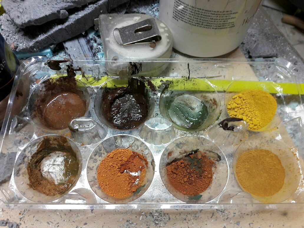Una vez seco todo lo pinto con pigmentos sintéticos, con agua y cola de carpintero como aglutinante. Aplico tonos más oscuros en las oquedades y luego más claros para ir obteniendo luces y por último matizo y fundo todos los colores.
