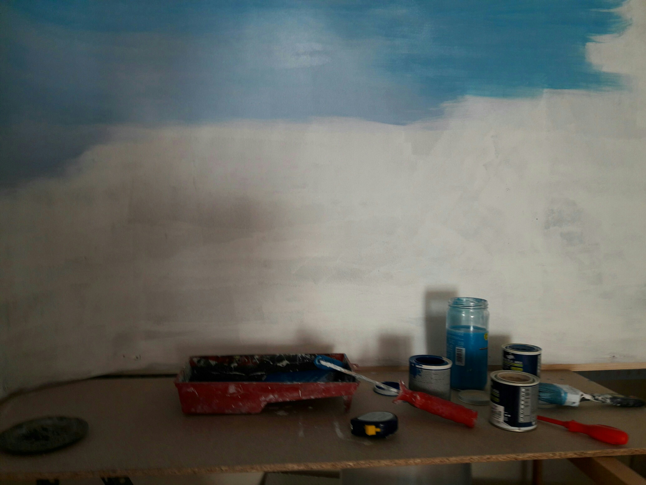También mi forma de hacer el cielo con PVC rígido transparente de 0,75 mm de grosor, 100 cm de altura y el largo que se quiera puesto que viene en rollos de 5000 cm. Una capa de imprimación universal y colores acrílicos al agua, azul luminoso, azul cielo y arena, más oscuros arriba y más claros abajo, con rodillo y brocha incluso para las nubes.