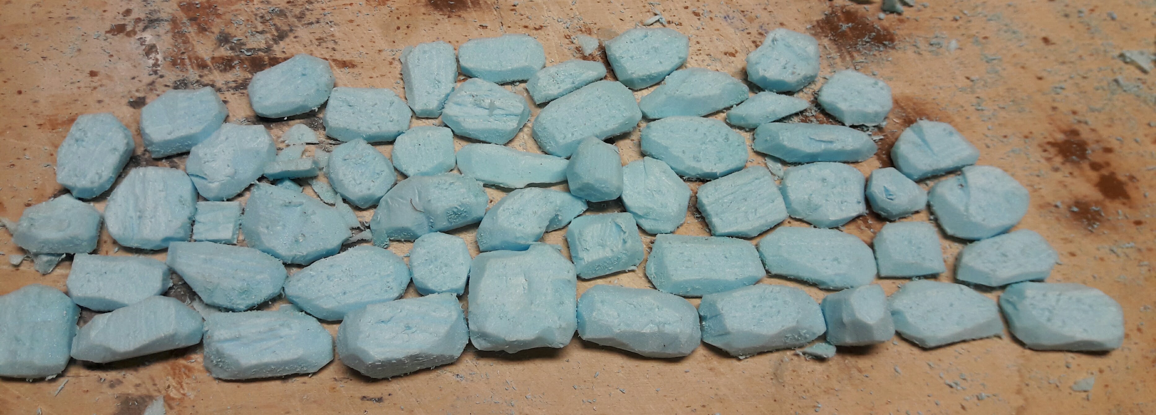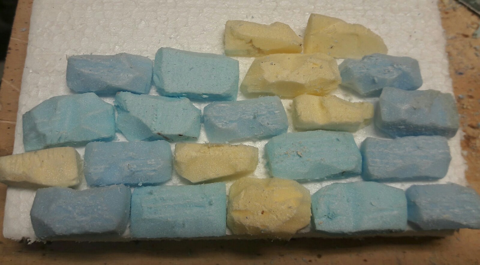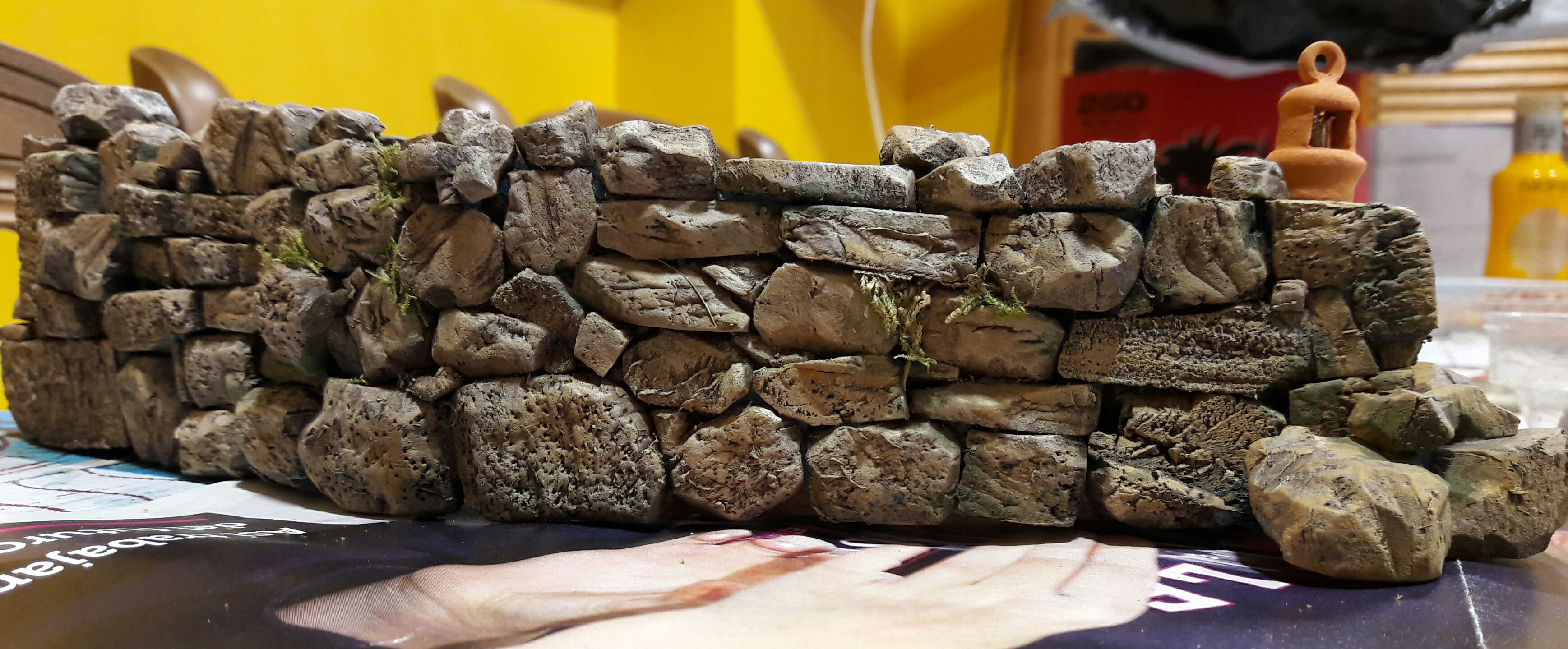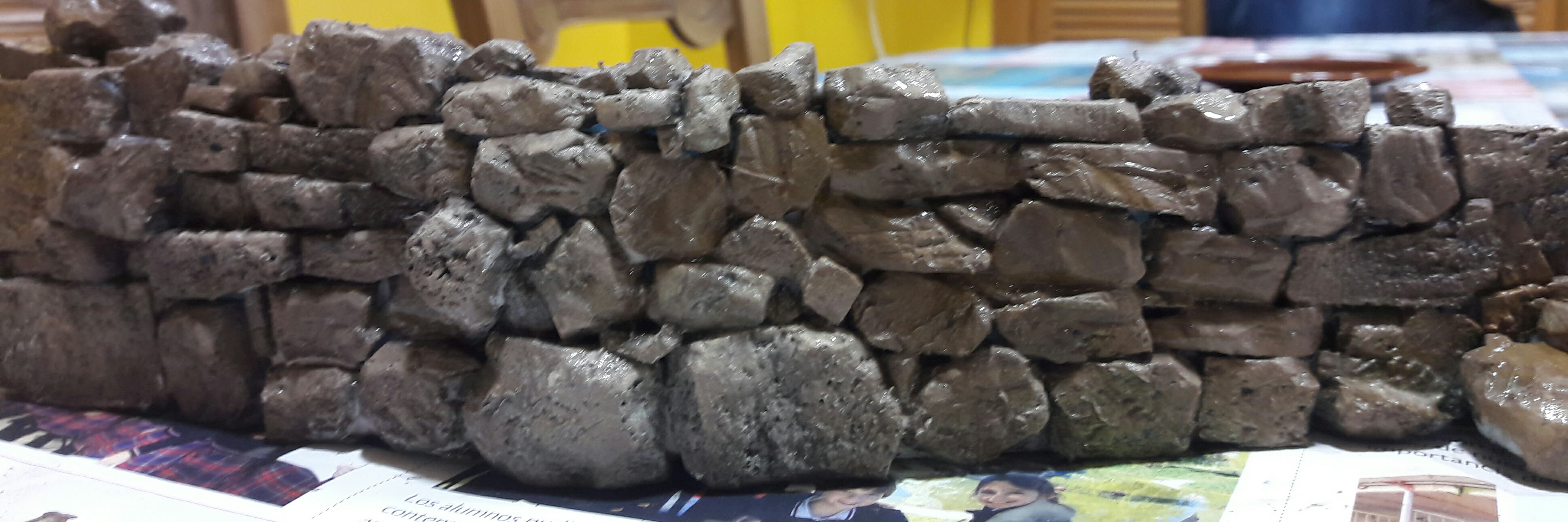 Ahí va un apunte de como hago los muros. Las piedras talladas las pego sobre una base de porex de bolitas con cola de carpintero, una vez pegadas las voy golpeando suavemente con una piedra y con un cepillo de púas para crear irregularidades y pequeños agujeros.