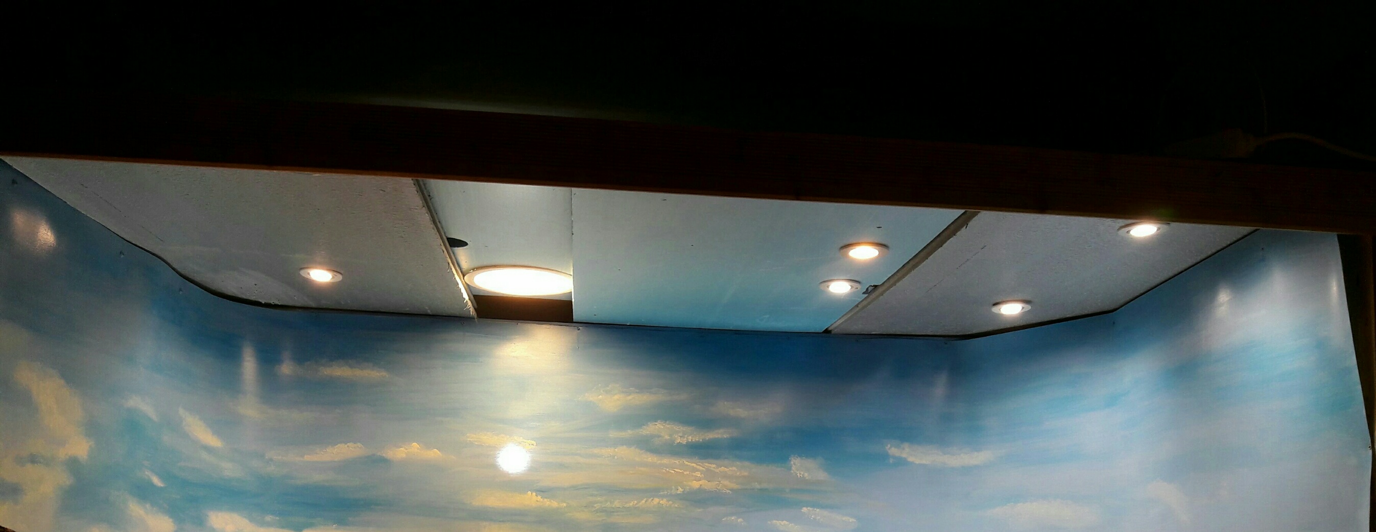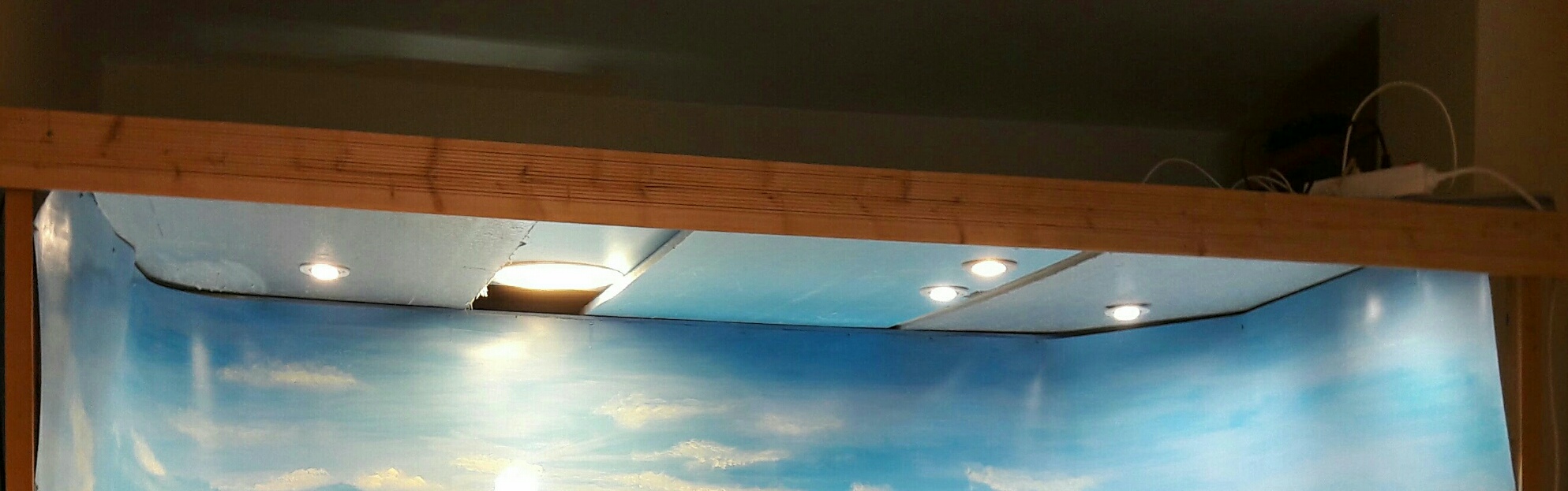 En otros montajes ha sido un poco más sofisticada con focos par de haz de luz colimada (paralela) con temporizadores etc. pero aquí son simplemente unos focos led de alta luminosidad y de luz cálida empotrados en porex de alta densidad que a su vez hace de techo, lo mismo que un downligth plano también de alta luminosidad y de luz cálida igualmente empotrado (se pueden empotrar directamente en el porex ya que no producen nada de calor) y luego, en el fondo dos regletas de 90 cm electrónicas fluorescentes de luz fría sujetas a la base con cinta de embalaje.