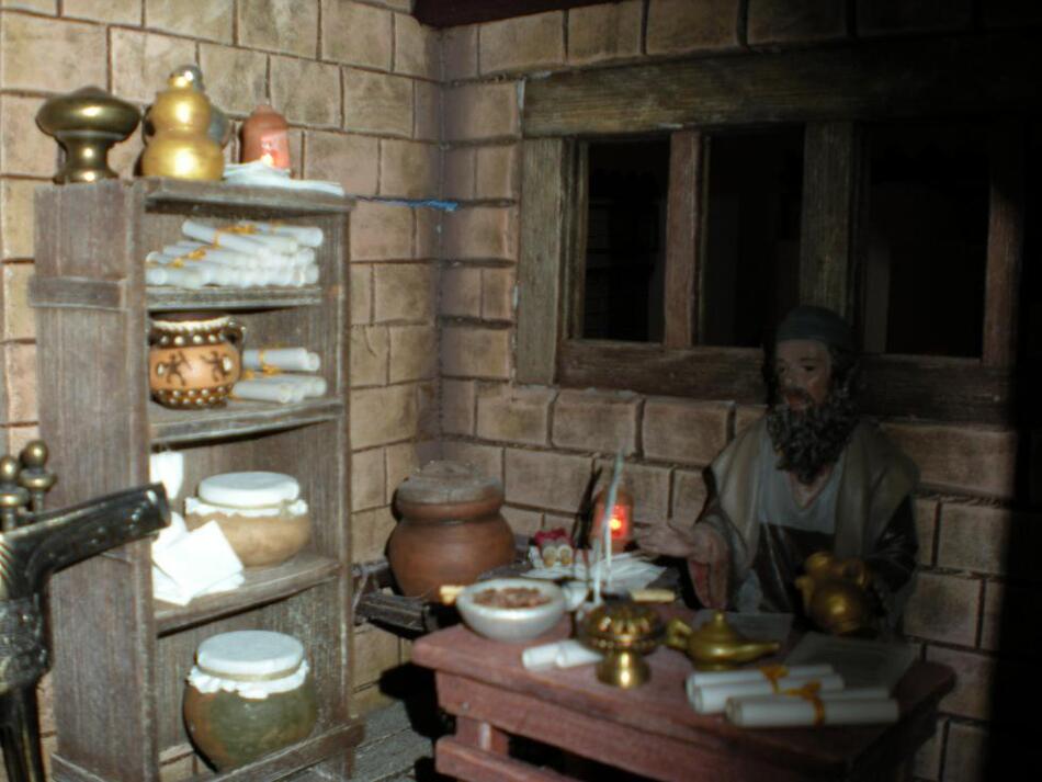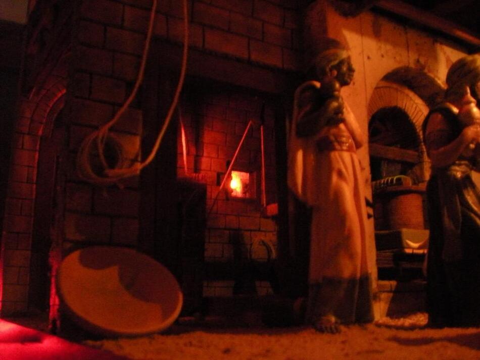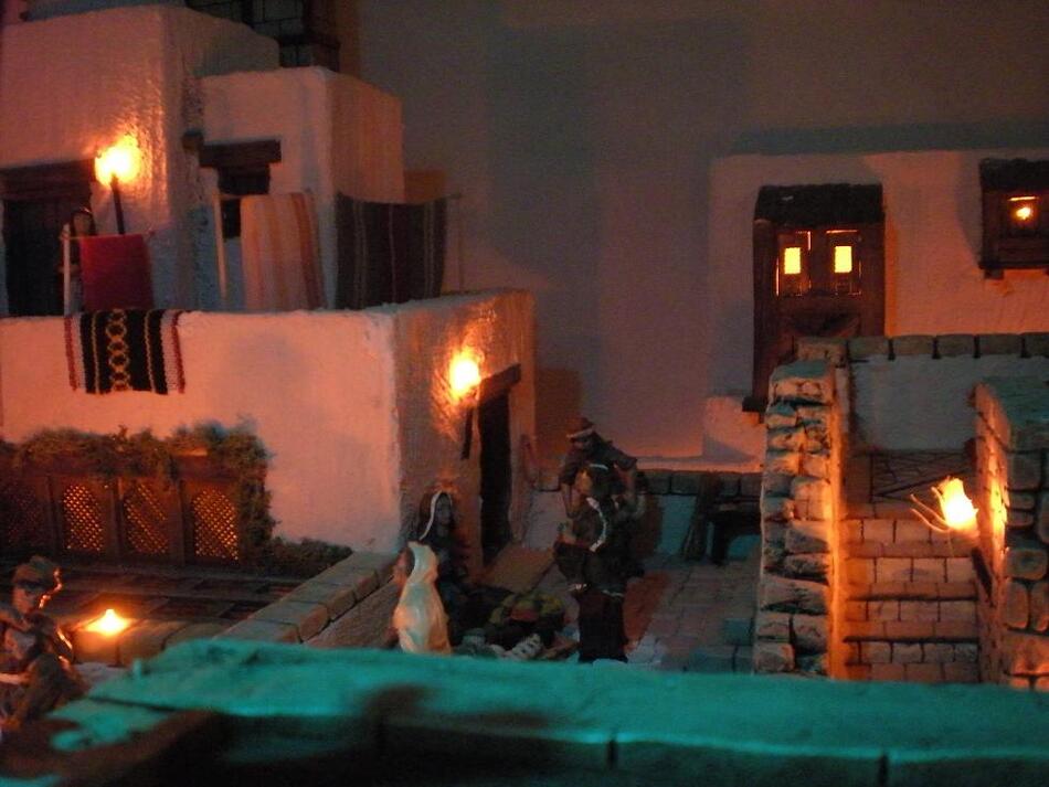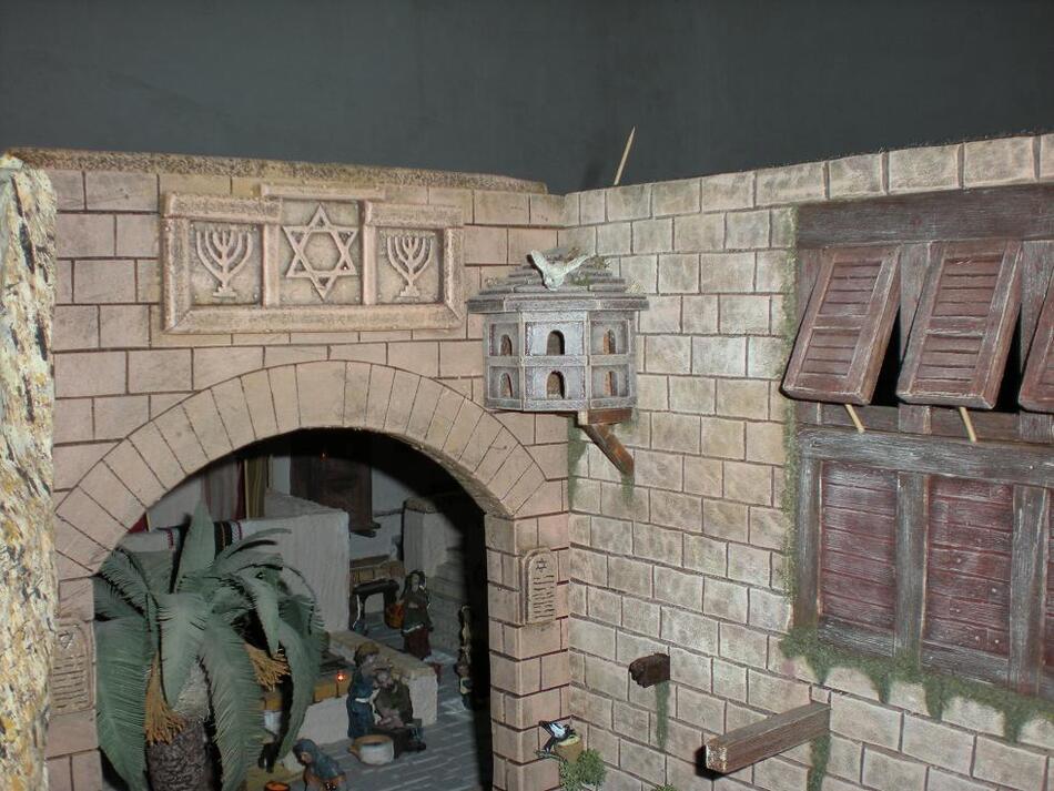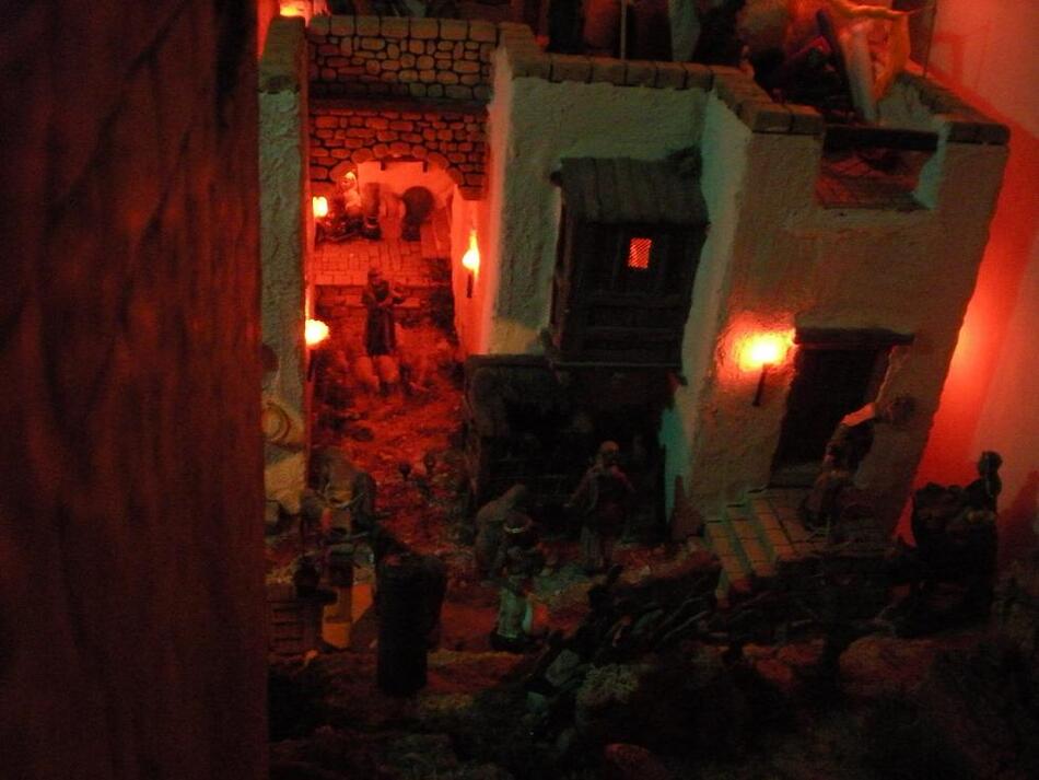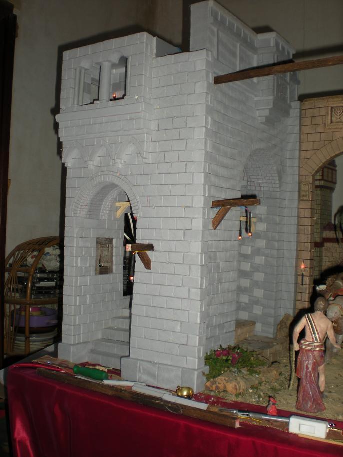 Marceastur, este es un proyecto que llevaba varios años queriendo hacer, y que sabía que para llevarlo a cabo me costaría un par de años. Las primeras casas, las hice para el belén de las navidades de 2008-2009, que son las de la parte trasera, las que tienen las azoteas, con la anunciación a los pastores, el puesto de verduras, el barbero y la vendedora de telas. La puerta, las torres y la fachada del templo, junto con las casas de la calle trasera, las hice al año siguiente, y este año ya hice toda la parte delantera, a excepción del trozo de muralla que no me dio tiempo a terminar. Y seguramente nunca lo daré por terminado, porque la intención es que cada año le vaya añadiendo algo nuevo.