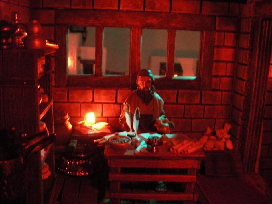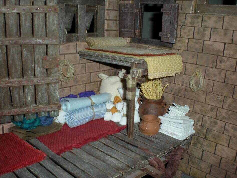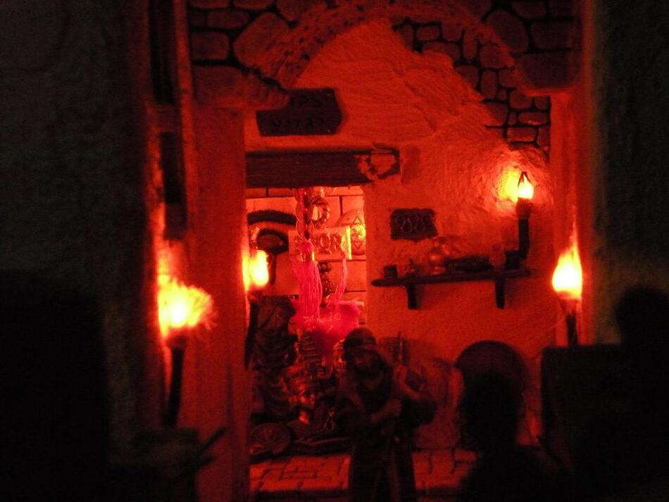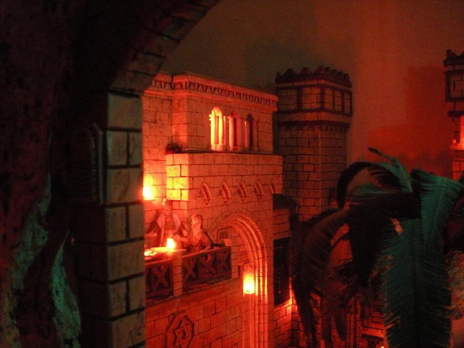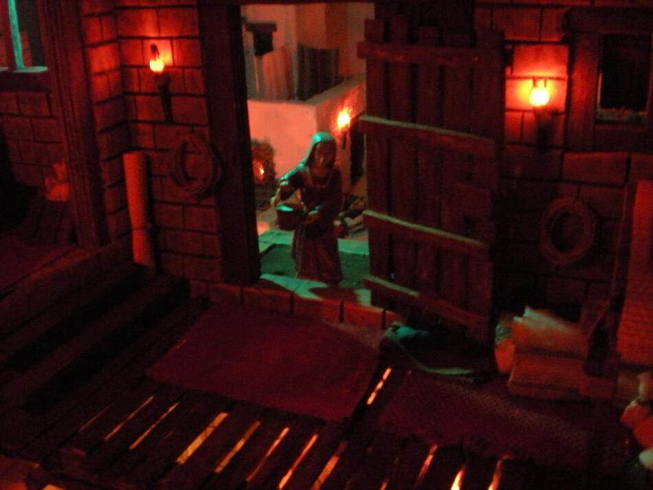 Y en respuesta a tu petición de más fotos, aquí tienes unas cuantas más. Empiezo por una del estudio del escriba, que he modificado un poco, cambiado de sitio la mesita y los cojines del primer plano, ponieno un farol encima de la mesita y otro en la mesa del escriba, y poniéndo luz al brasero de pie. Creo que ahora esta escena está mejor. Y continuo con fotos de la nueva construcción, del lienzo de muralla que me faltaba por construir. Ahora solo me falta pintarlo y terminar los últimos detalles, como un pequeño reloj de sol que quiero poner en la pared del frente, entre el farol y el balcón, pegado a la esquina de la calle donde está el pastor tirando del camello.