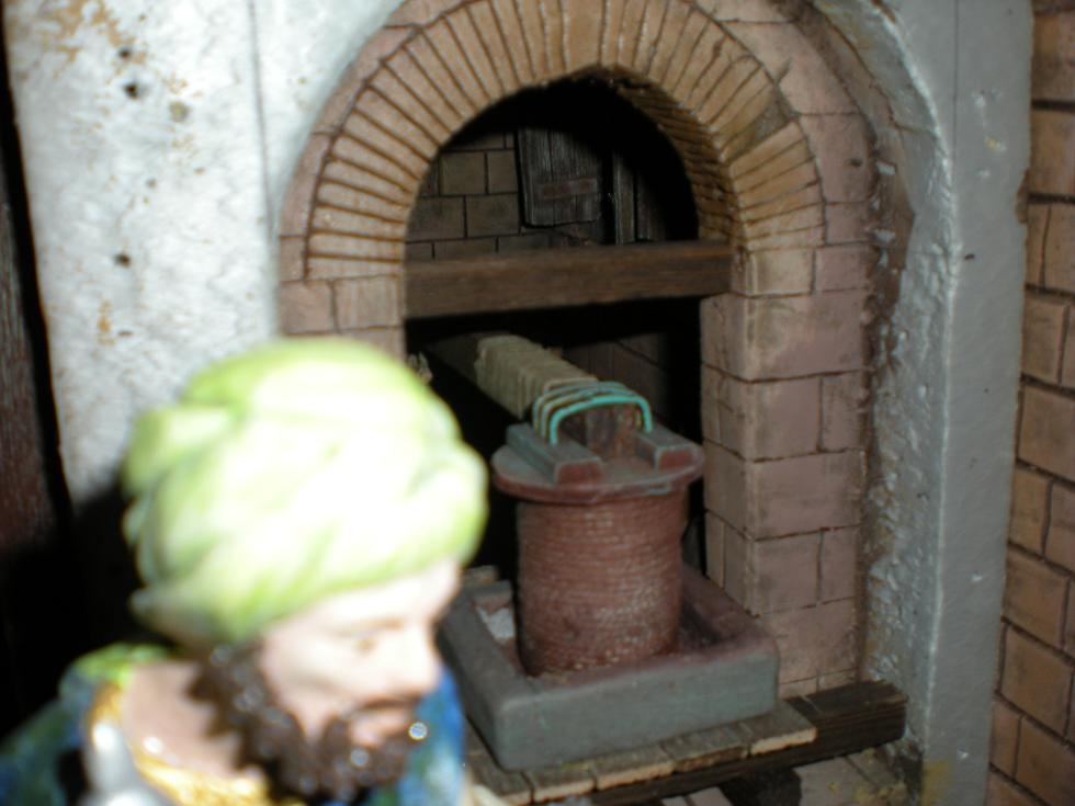 Y en respuesta a tu petición de más fotos, aquí tienes unas cuantas más. Empiezo por una del estudio del escriba, que he modificado un poco, cambiado de sitio la mesita y los cojines del primer plano, ponieno un farol encima de la mesita y otro en la mesa del escriba, y poniéndo luz al brasero de pie. Creo que ahora esta escena está mejor. Y continuo con fotos de la nueva construcción, del lienzo de muralla que me faltaba por construir. Ahora solo me falta pintarlo y terminar los últimos detalles, como un pequeño reloj de sol que quiero poner en la pared del frente, entre el farol y el balcón, pegado a la esquina de la calle donde está el pastor tirando del camello.