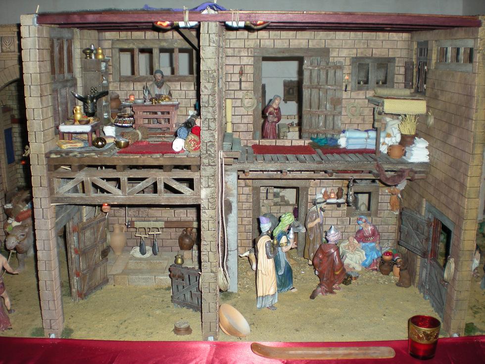 Fiestas: Me alegro de que te guste la escena del ángel. Quería hacer algo original, y en unprincipio lo iba a poner con los pastores dormidos del primer plano, pero luego pensé que sería una idea muy original ponerlo en la azotea de una de las casas en un segundo plano.