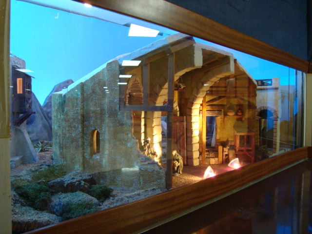 Este es el Belén que he montado este año en la cafeteria de mi centro de trabajo en Colmenar Viejo (Madrid). Lo hice con las construcciones que fuí copiando de la revista Taller de Belén. Se trata de un Belén cerrado de 3mts. de ancho x 1,50 mts de fondo. Las figuras de primer plano son de 16 cms, adquiridas en el mercadillo navideño de Madrid, otras de la firma Oliver y las del fondo son de los "chinos". ¡No había más presupuesto!. Espero que la empresa se anime y cada año vayamos adquiriendo algunas figuras más.