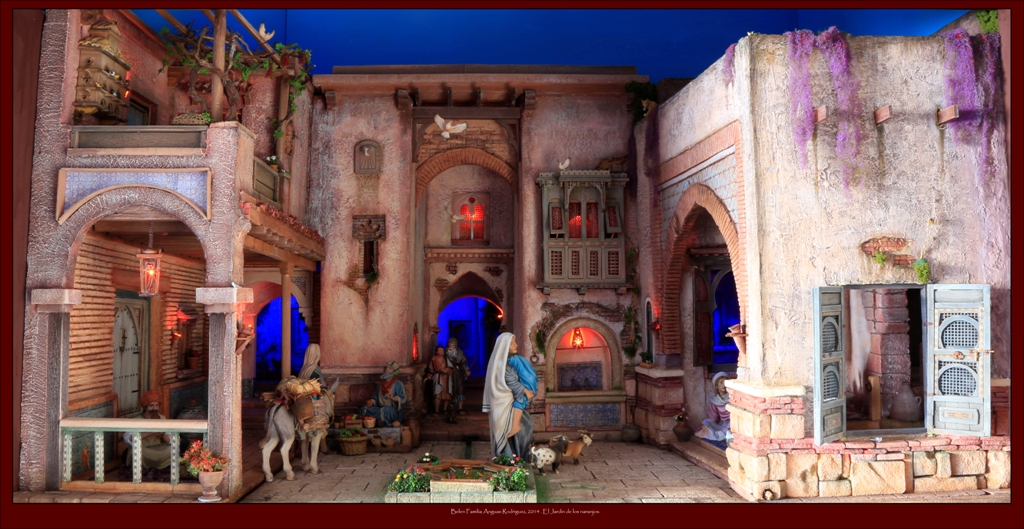 El punto de partida fue uno de los cuadros de tipo morisco...oriental...sefardí...que viene poniendo la compañera Memen en su apartado sobre pintura costumbrista. Aunque del cuadro...al Belén, hay poco parecido, más bien casi ninguno, pero la idea fué esa, un arco central por el que se entra a una zona abierta y ahí ya dí paso a mi imaginación...para bien o para mal, claro, je, je, je.