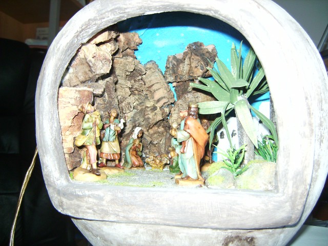 Hola,pues yo os enseño un belen que he hecho en un anfora de barro,la pinte,le di una pátina para envejecerla y las figuras son de 5cm,son mias.saludiños