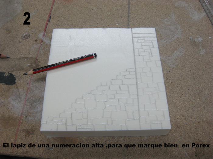 Foto 5 -5 bis : En la base que hemos cortado ,probaremos la figura para dibujar la peana y dibujaremos las losas ó piedras y luego con el soldador haremos la peana y lo pasaremos por las rayas dibujadas y luego cúter y la misma operación que con las paredes .