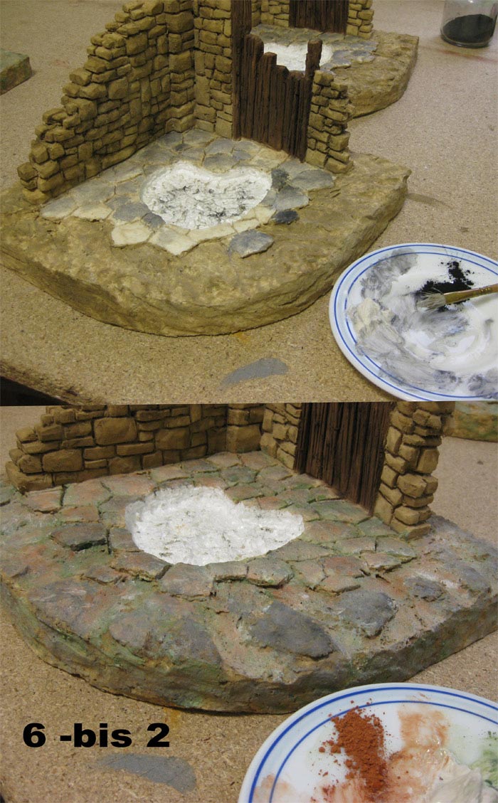 Foto 6 - 6 bis - 6 bis 2 : Pintado ,masilla Adefix ó similar y tierras ó pigmentos .A la vez que se moja un poco de masilla se coge un poco de tierras ,en este caso sombra natural y se pinta a la vez ,sin hacer un solo color si no dando diferentes cantidades para no hacer un color uniforme .