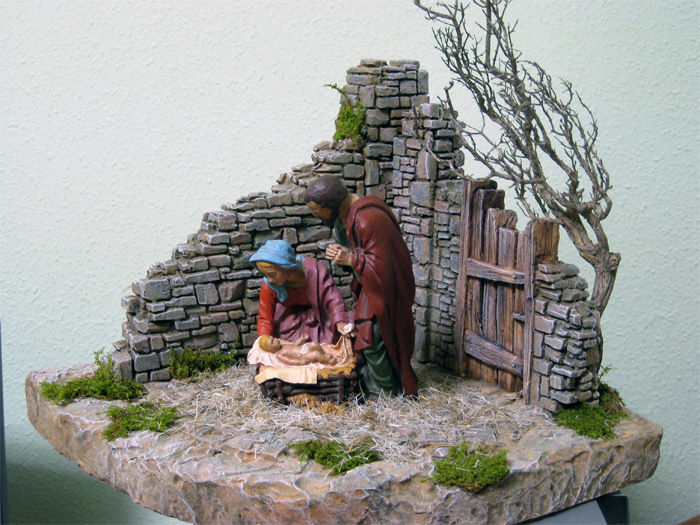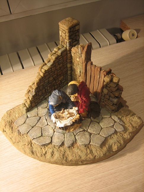 Espero que no te moleste galtxa, pero cuando vi este nacimiento me gusto tanto que no me pude resistir a hacer uno inspirandome en el tuyo, aunque un poco más personalizado. Aun me falta muchísimo por aprender ya que el tallado y pintura de las piedras no tiene nada que ver con el tuyo, pero aún así estoy muy contento con el resultado.
