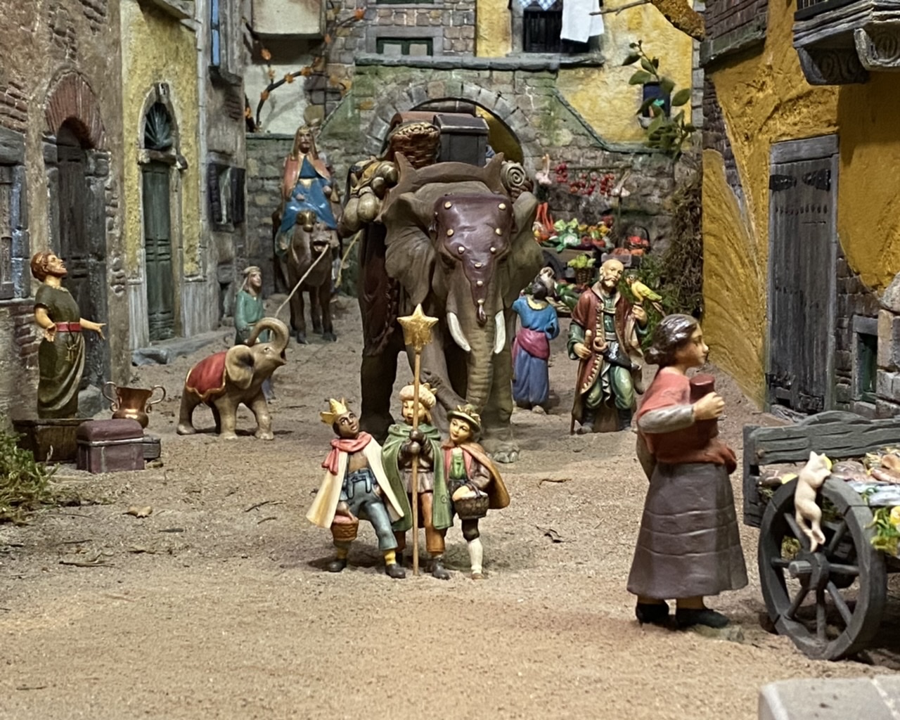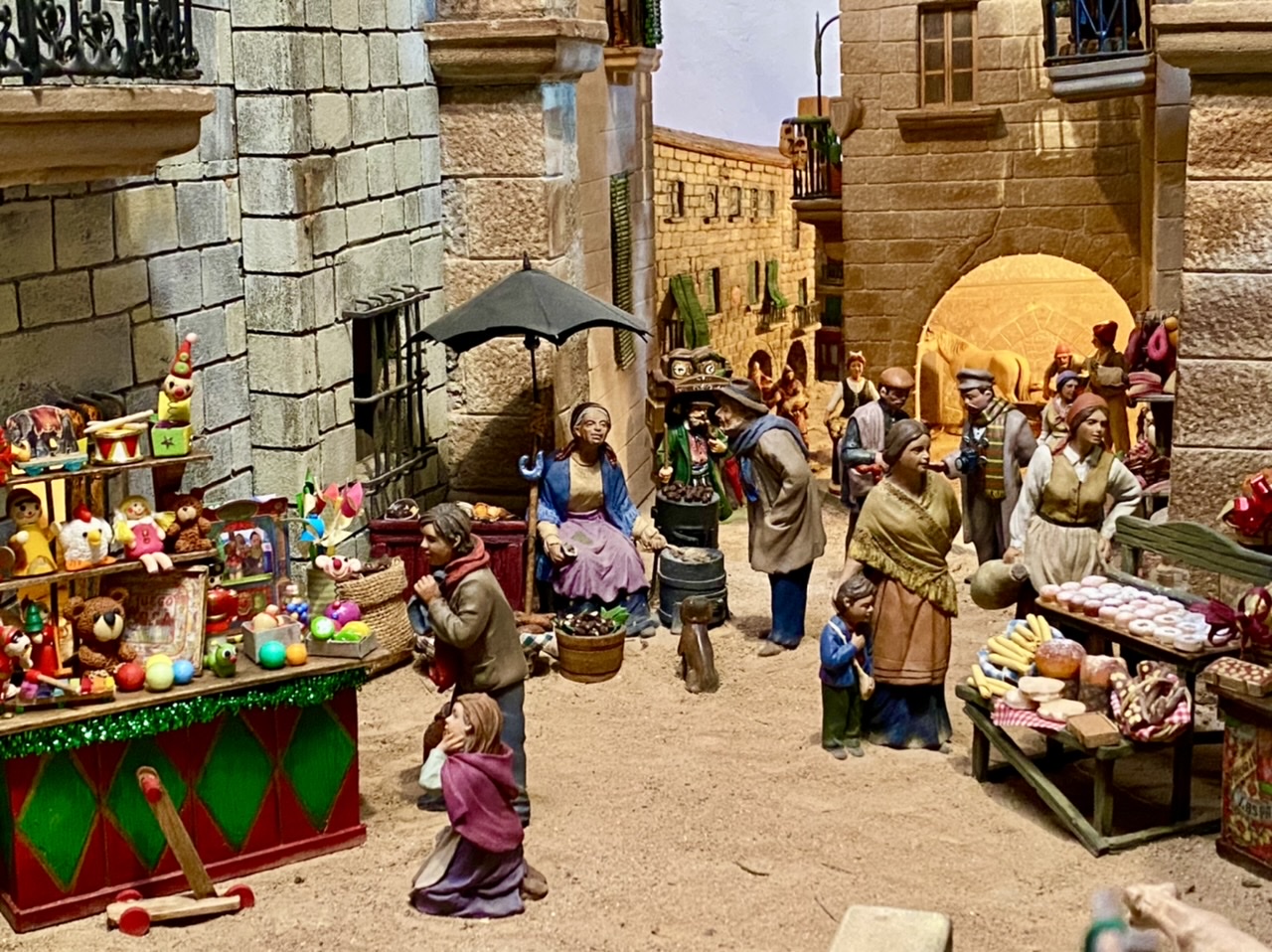 Como veréis, esta vez no he hecho grandes cambios, sino que he cambiado escenas de sitio y he añadido este mercado navideño, que quiere ser una pequeña recreación de la Fira de Santa Caterina, que se celebra todos los años alrededor de Santa Caterina (25 de noviembre) desde hace más de 500 años en Arbeca, mi pueblo y en la que durante dos o tres días el pueblo se llenaba de puestos de venta de todo tipo, antiguamente sobretodo de animales y aperos para el campo pero también de puestos de comida y ropa, así como de juguetes (mi padre me contaba que, de pequeño, los Reyes Magos se daban una vuelta por la Fira para surtirse de regalos que traer a los niños, je je). Desde hace unos años también se ven puestos de venta de adornos navideños, así que he querido recrear un poco este ambiente y lo he hecho con la vista de la Plaza Mayor de mi pueblo al fondo.