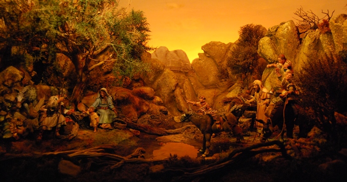 Os presento nuestro belén, realizado por mi madre y un servidor. Es un belén de 4 metros cuadrados aprox, con figuras originales de Rafael Guerra, queriendo representar la escena que la Sagrada Familia hace un descando en su Huida a Egipto.