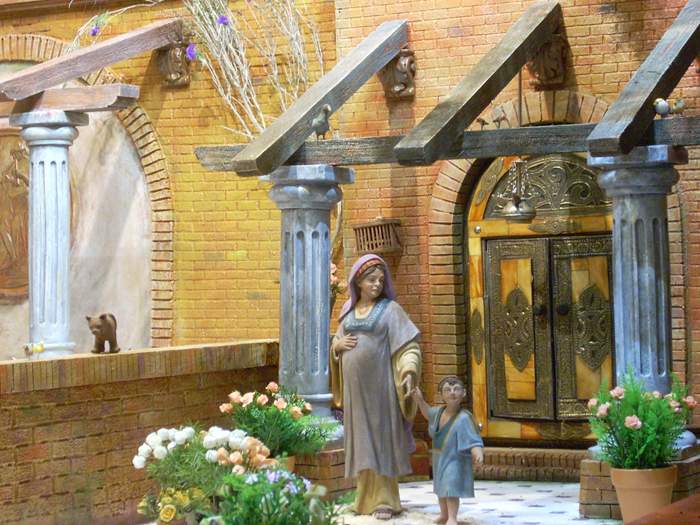 Belen fantastico y a la vez sobrio y elegante, cargado de detalles y trabajos minuciosos que impactan, como esa puerta! que belleza! y las plantitas... las figuras son tambien muy lindas. Un lujo poder comtemplar esta obra.Mi más sincera enhorabuena. Saludos