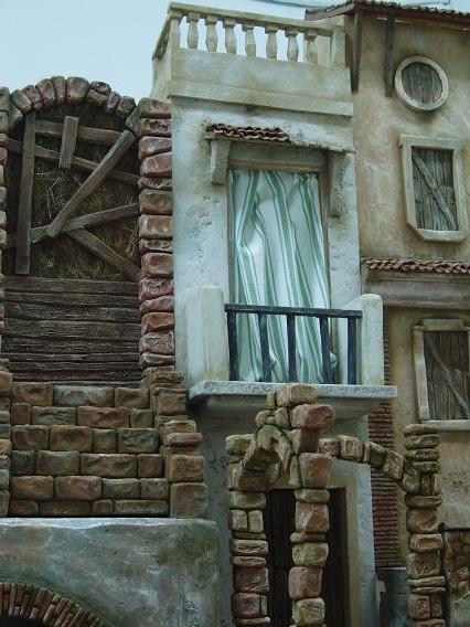 En las fotos y debido al espacio del que dispongo en mi local no cabe el frente entero ,pero al lado de las casas vá la base para el nacimiento de estilo napolitano,que es una montaña por la que discurren unas escaleras para poner las figuras subiendo y dirigiendose al portal.