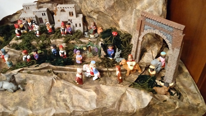 Este año el Belén llegó más tarde, pero llegó. En mitad de una mudanza de fecha incierta (pero que afortunadamente y contra todo pronóstico se resolvió antes de Navidad), y con una vorágine de muebles y cajas buscando ubicación, pudimos colocarlo. Especial por ser el primero en el que participa mi hija de forma activa, y en el que cada día encuentro cambios que le dan vida (una mulita del Belén infantil de Mirete va transitando por él con libertad). Figuritas de Alborox (dotadas de una resistencia frente a caídas que a priori no consideraba posible, y por primera vez con notable presencia de personajes regionales), un par de animalitos de un misterio infantil de Ortigas, de aquellos que venían en botijo, papel de montaña, lana para simular el musgo, y construcciones del Belén de Ediciones del Prado.