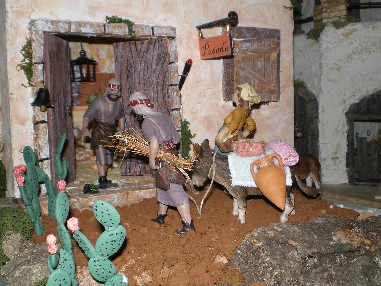 pd:yo lo único que le haría a tu belén, bueno mas bien a una figura, en la foto de la posada, el pastor que sale, es el mismo que entra tirando del burro, y se nota mucho, yo haría dos cosas, o los cambiaría de sitio (para que no estén juntos) e pintaría uno de los dos, tan solo una capita de pintura ya le hará parecer que no son iguales, pero hijico,jajaj....es que los pones uno delante del otro y parece que se está mirando en un espejo,jajajaj