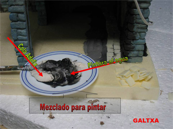 mijita - 30/4/2007 12:07  cuando dices que la masilla la mezclas con la pintura (tierras) ¿es la primera y única mano de masilla que le das ? ó ¿necesita una primera mano solo con la masilla?  Hola mijita es la única mano de masilla que le doy ( masilla + muy poco de pintura de tierras + poca agua ) tiene que quedar como un puré , luego para dar colores tanto a las piedras como al suelo ( para que agarre ) un poco mejor la pintura y no sea tan liquida la pintura y pueda hacer escurriduras la mezclo con muy poca masilla ( casi nada) es para dar brochazos , y si utilizarías pintura al agua solo necesitáis la primera mano de masilla+ tierras y para pintar las piedras de colores no le tendrías que dar masilla ya que pintarías directamente del bote con esta segunda forma ice las tres casas que tengo puesto en otro album el resultado es el mismo espero verte aclarado tus dudad y me alegro que te haya gustado siempre resulta gratificante . Muchas gracias Dukatz por los elogios