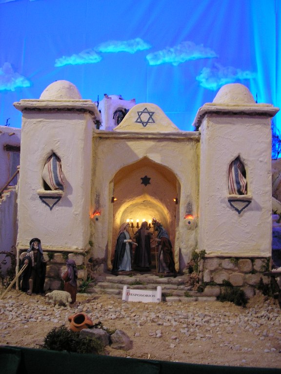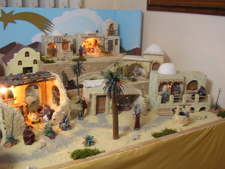 Las figuras que se exponen son obra de artesanos murcianos, la mayoría de Serrano y Jesús Griñán, y sirven para recrear junto con las construcciones, también artesanales,las distintas escenas desde Nazaret, Belén o Egipto. Una cordillera de montañas con manantiales incluidos sirve para separar los espacios que van mostrando de forma didáctica la historia de Jesús.