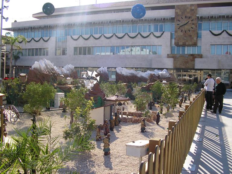 Operarios municipales trabajan hoy en los últimos retoques del belén donde se colocarán un total de 1.200 figuras, algunas de las cuales forman parte de las 25 escenas dotadas de movimiento con las que cuenta el conjunto belenístico que se expone al aire libre. Con una efectiva iluminación, incluso algún efecto óptico el belén de San Javier se caracteriza por su fiel reproducción de la historia del nacimiento de Jesús.