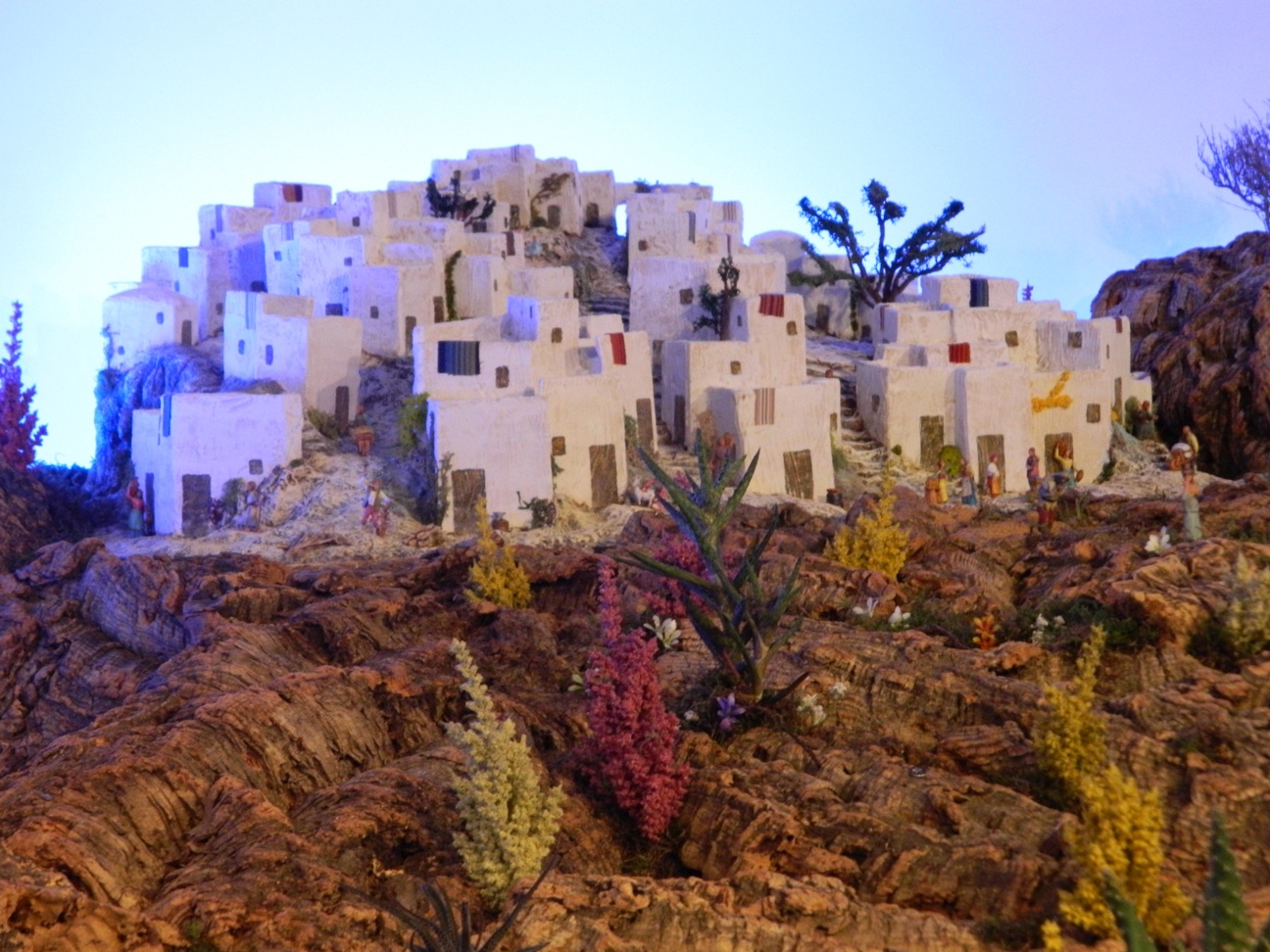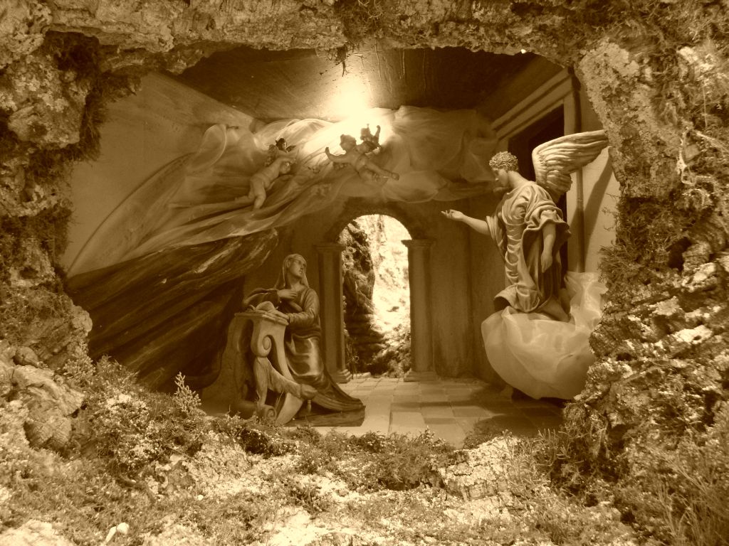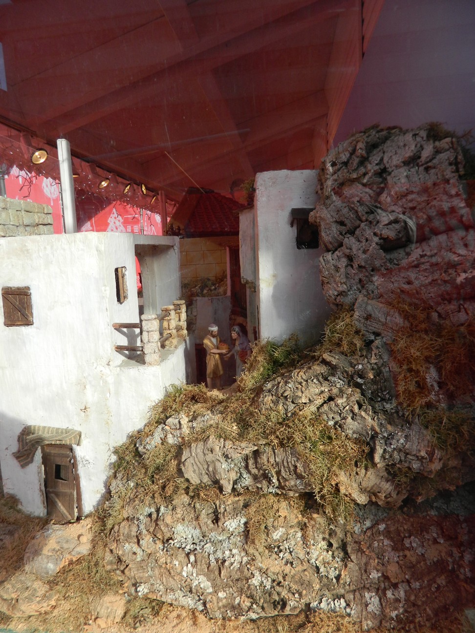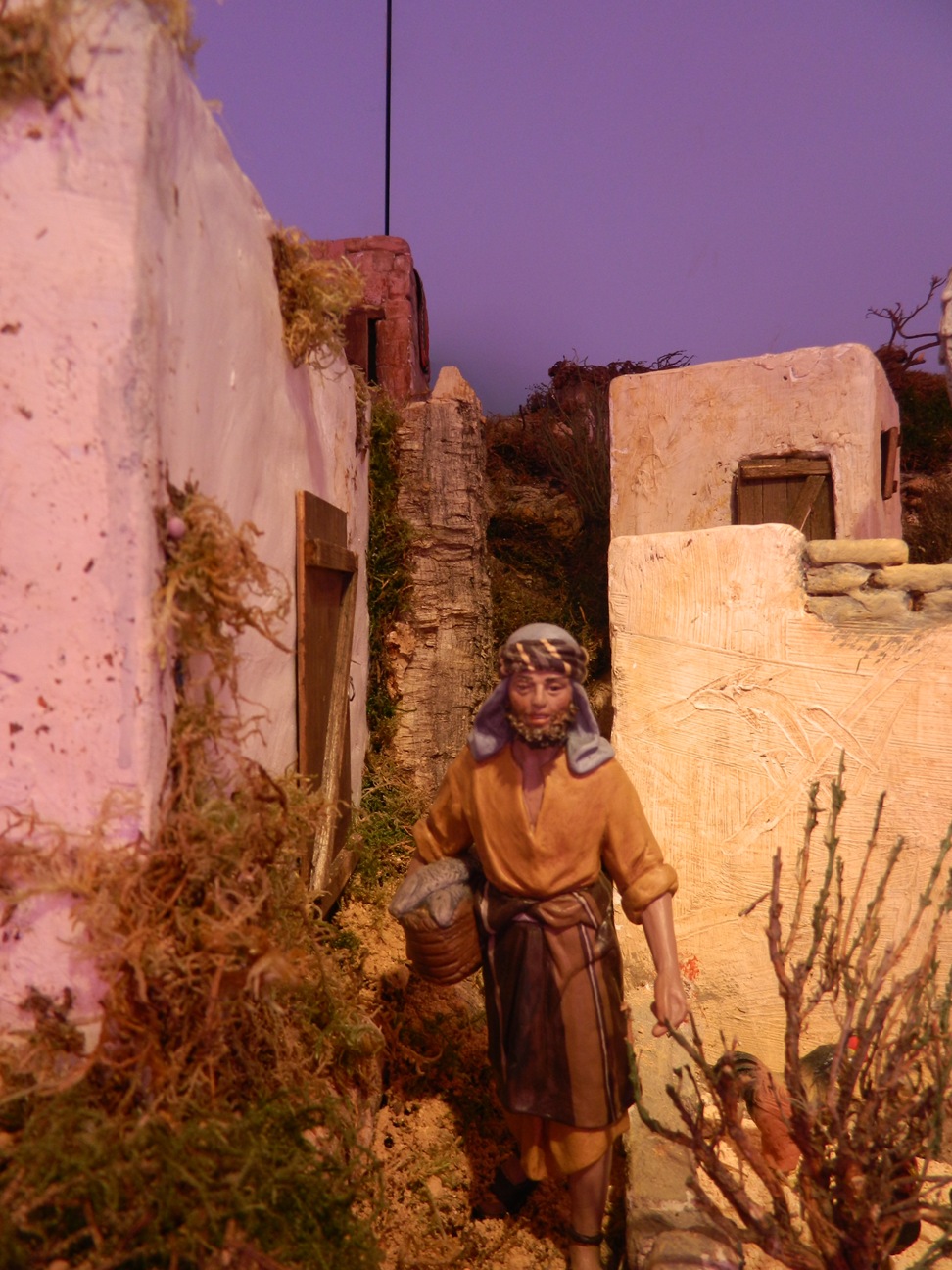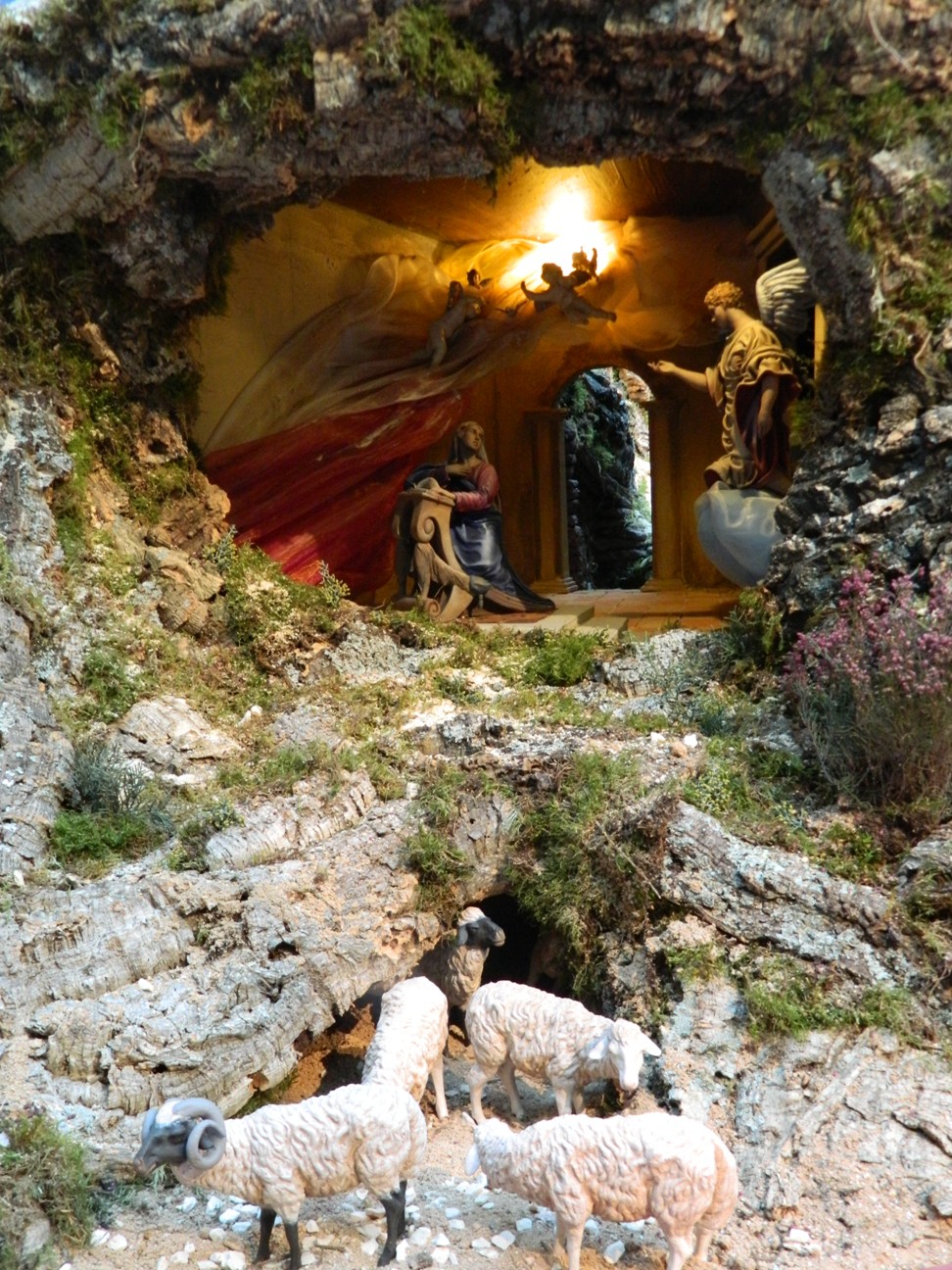 Pero hemos querido que este Belén tuviera una evocación muy directa al Greco y para ello se eligió el cuadro que recrea la Anunciación a María, del Museo del Prado. Con la colaboración de la escultora Montserrat Ribes se ha reproducido el contenido de este conocido cuadro, con dos figuras de barro a palillo, de unos 28-30 cm, que reproducen exactamente dicha escena. El efecto es espectacular y como el cuadro ya es muy conocido, adjunto la fotos de dicha escena en dos formatos distintos que dan una idea más precisa que los de color, siempre “difíciles” en una ambiente de corcho y musgo. Las fotos están cedidas por bob-trenzzas y la realización de la escena, en gran parte, es también de nuestro amigo forero.