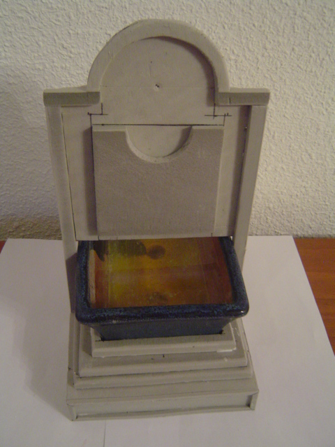 Gilda creo que has dado en el clavo, pero tiene una solución muy sencilla y es prolongar el frontal mas abajo para que parezca que es el final del vaso y asi no se verá que éste va encajado en el frontal, ¡estupendo! eso es lo que le falta, cortar la prolongación del vaso, asi quedará totalmente terminado. Voy a trabajar en ello y cuando lo tenga lo subo, además intentaré hacer unas fotos como si estuviera ya instalado en una pared, con el fin de que no se vea la contuación del vaso, que eso también distorsiona el aspecto de la fuente, y además dará una idea de como quedará colocado.