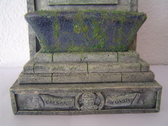 Lo del libro no importa, y te explico, la fuente estará en un jardín que se ve a través de arcos en una estancia decorada al estilo del interiorismo holandes del siglo XVII por lo que efectivamente en ese siglo si que existían libros, pero creo que me has dado una muy buena idea ya que al poner un pergamino de bajorrelieve si que podré poner la frase entera sin cortes, lo cual hará mas estético y mas acorde con lo representado en el bajorrelieve del pié de la fuente, es decir la imagen de Augusto, asi que me has convencido, por lo que te agradezco muchísimo tu idea.