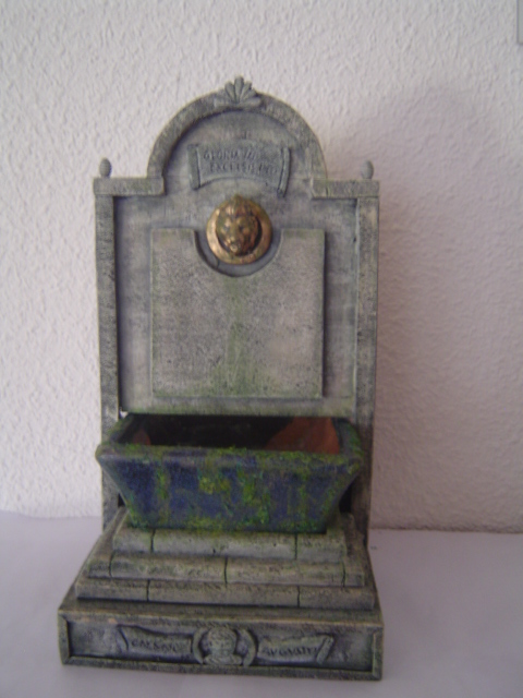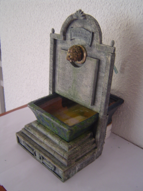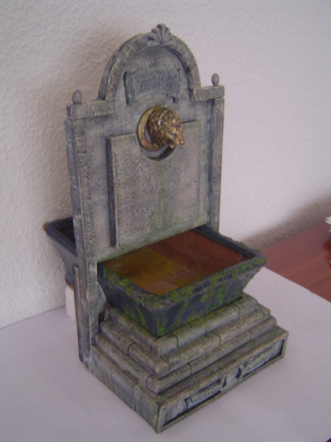 En el paso a paso aparecen por orden de fotos primero el frontal luego la estructura, el vaso, la estructura montada en el vaso, el grifo de cabeza de leon, el conjunto montado y pintado, los bajorrelieves y diversas fotos de diferentes ángulos para que podais apreciar el trabajo totalmente, aunque ya lo he probado con su motor y con agua, el motor está desmontado hasta su posterior utilización, para poder manejar la miniatura con mas facilidad.
