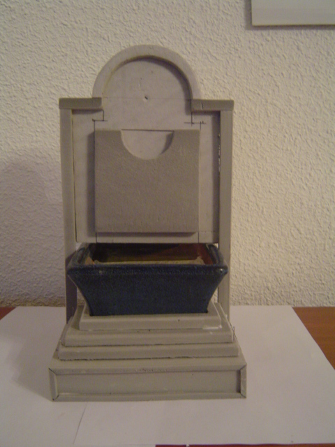 Como vereis he utilizado como vaso de la fuente un recipiente cerámico perteneciente a un bonsai que en su dia falleció y como lo tenía por casa, me dio la idea del vaso cuando realicé el boceto.