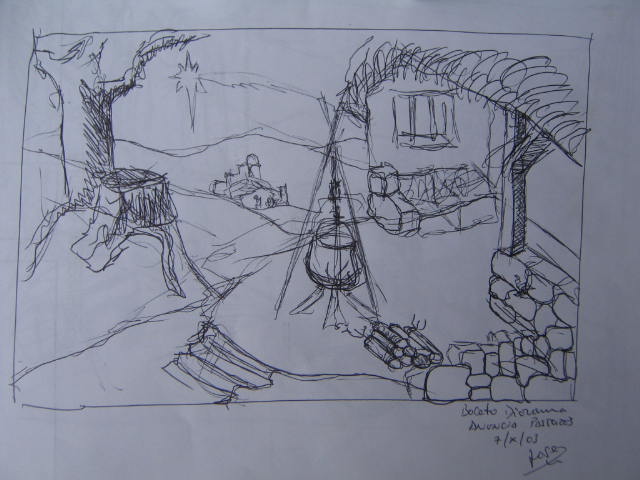 Hola, yo tambien voy a poner mi primer boceto de proyecto 2007-2008. Es el boceto del lugar por donde se accede al mercado. Pronto pondre tanto el resto de mercado como los dibujos de lo que podrá ser si Dios quiere mi belen.