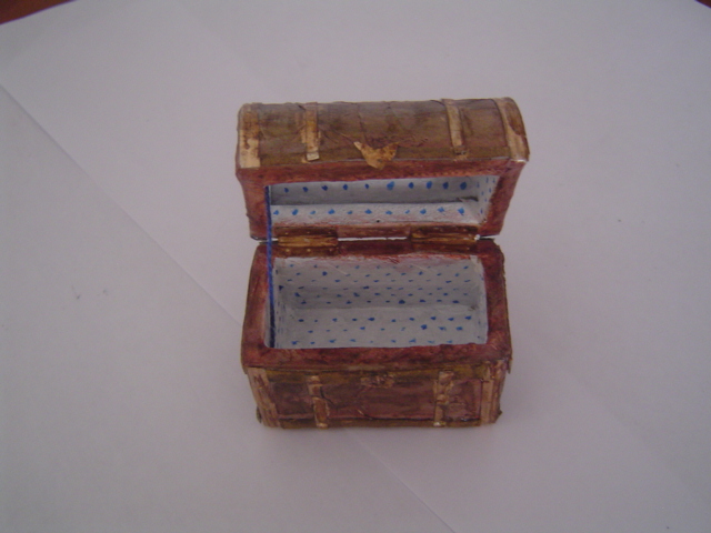 Santi muchas gracias por tus comentarios y por tus felicitaciones, las fotos no son muy buenas pero en vivo el baul tiene una buena calidad ya que parece no de madera sino de cuero; he seguido la técnica de Lola (a quien agradezco sus videos) de imitar la piel, luego con estaño de manualidades he hecho los herrajes y las partes del metal. El repujado es muy simple pues es muy pequeñito. Al final le he dado una pequeña capa de oro viejo Kokolo y lo he envejecido con betún de judea, y bueno, en vivo tiene un buen aspecto, mucho mejor que en foto (yo es que la fotografía definitivamente no es lo mio, pero hago lo que puedo).