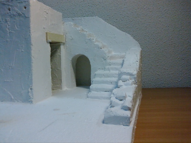 La idea es una casa con unas escaleras y patio a diferentes alturas y en los bajos quizás algún oficio.