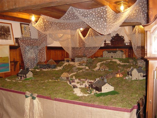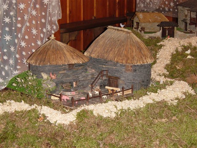 Lo forman reproducciones a escala de construcciones de la zona, como palacios,, casonas o las pallozas. Están realizadas por Eloy Fernández Robles, un artesano de Fabero en materiales naturales, piedra, pizarra, etc. Yo estuve viéndolo el domingo y las construcciones son espectaculares.