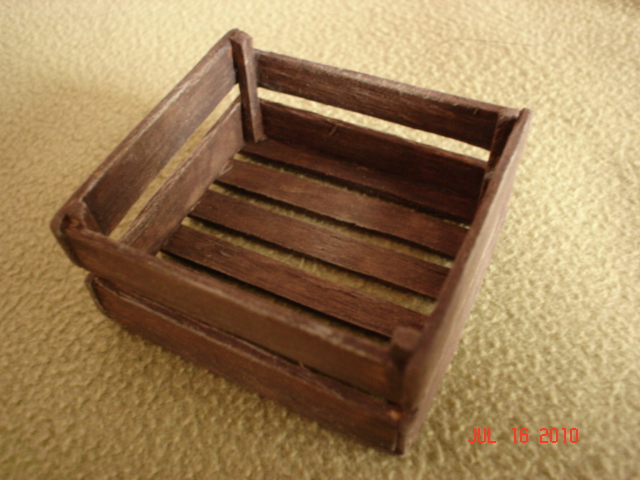 Jarota, todas las cajitas las hice con madera; en el nacimiento las coloco con distintas frutas o verduras y a su vez las coloco o sobre mesas (también hechas con madera) o en puestos de venta.