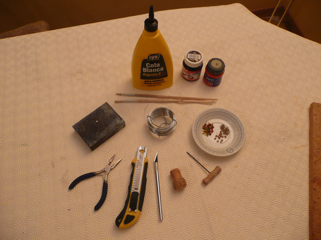 MATERIALES: Tapón de corcho de champagne; cuter; alambre; alicates de corte; lija; alfiler "boni"; cola blanca de acabado transparente; pintura negra y roja; barrena o punzón; especias de cocina.