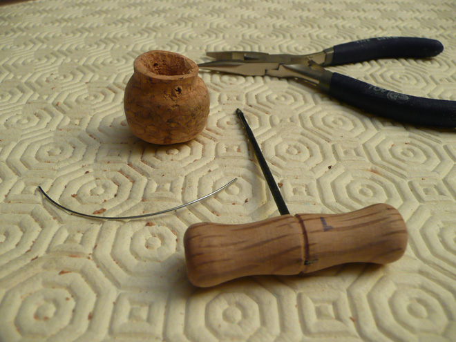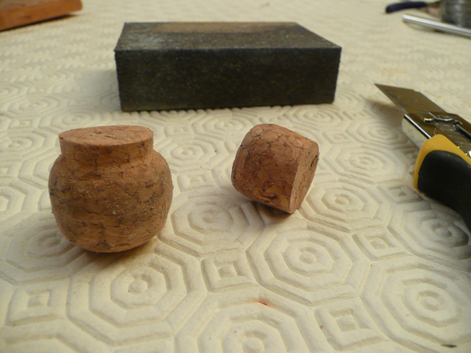 PASO 5: Con el trozo de corcho que cortamos al principio, en el PASO 1, cortamos una pequeña lámina para hacer la tapa del caldero y clavamos el alfiler "boni" en el centro de la misma, a modo de agarradero.