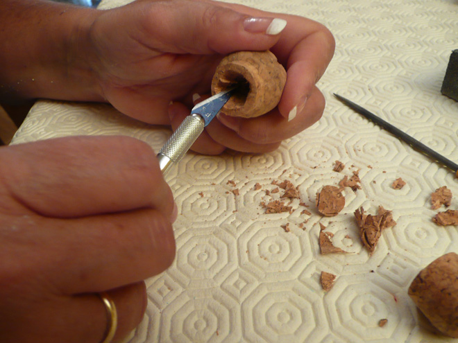 PASO 2: Con un cuter fino, vaciamos el interior del corcho